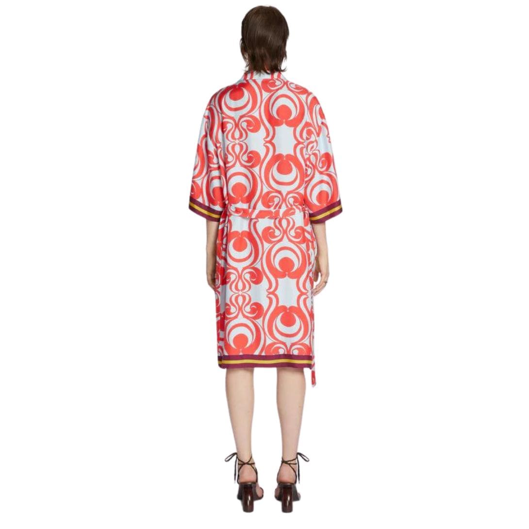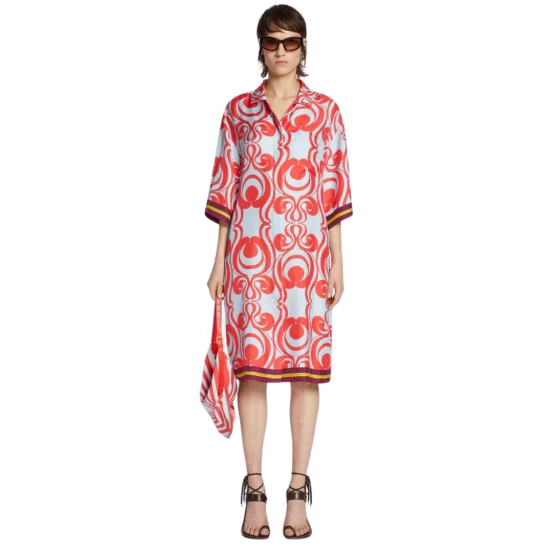 The DRIES VAN NOTEN SILK SHIRT DRESS RED embodies a luxurious blend of effortless style and artistic expression. Renowned for his mastery in combining bold prints with fluid silhouettes, Dries Van Noten has crafted a garment that seamlessly merges comfort with high fashion.
