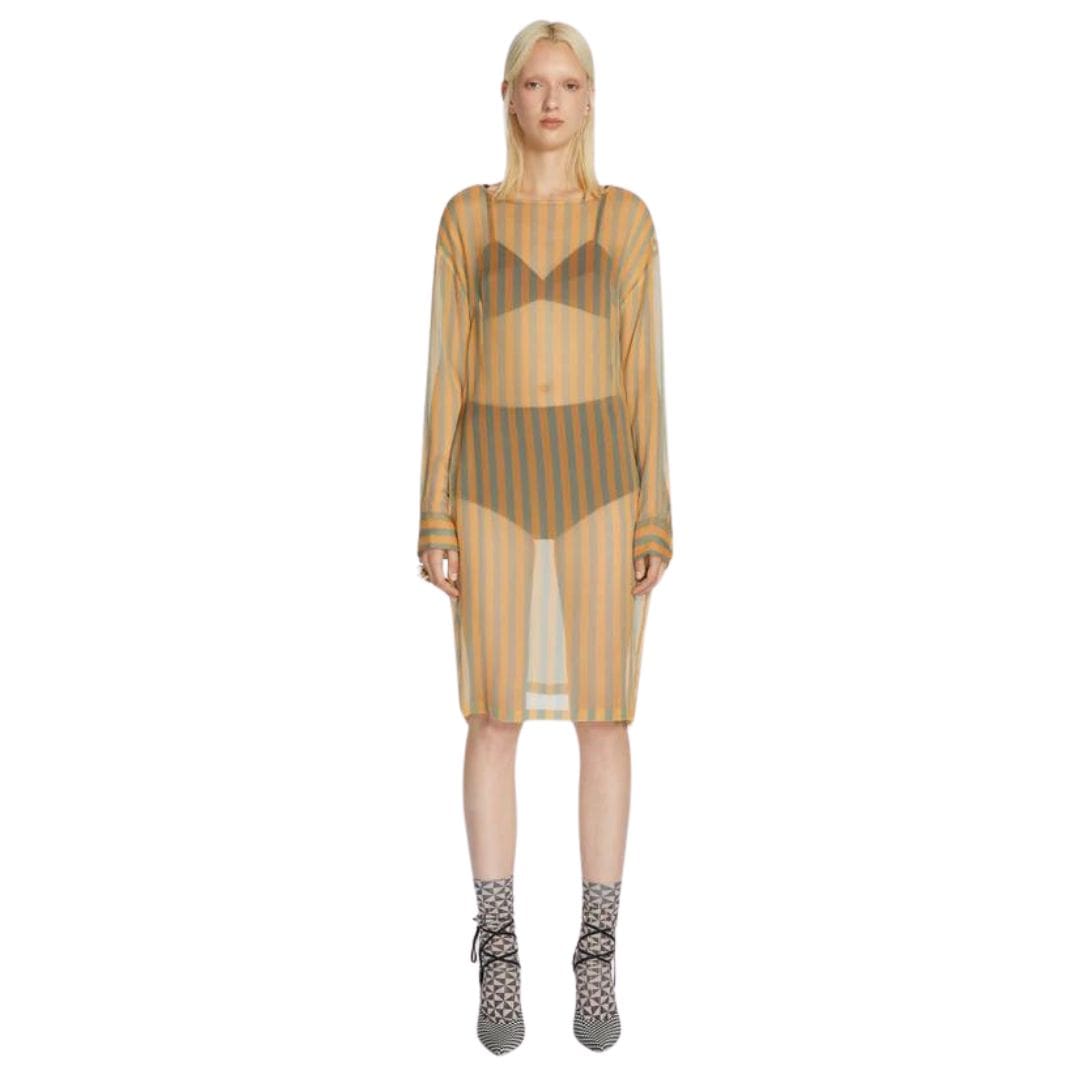 Immerse yourself in the sophisticated allure of the DRIES VAN NOTEN STRAIGHT SILK DRESS PEACH, meticulously crafted from sheer striped silk. This exquisite garment embodies a harmonious blend of modernity and timeless elegance, offering a silhouette that exudes effortless grace and versatility.