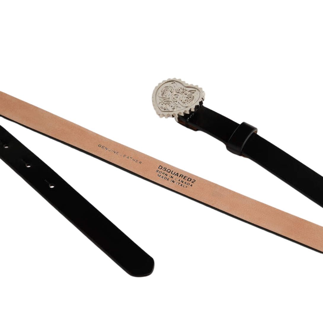 Crafted from high-quality leather, the belt boasts durability and a sleek aesthetic. Its smooth surface serves as the canvas for the centerpiece – a striking heart-shaped buckle that instantly commands attention. The bold emblem is adorned with intricate detailing, showcasing DSQUARED2’s meticulous attention to design elements. The polished metallic finish of the buckle adds a touch of glamour, elevating the belt from a mere accessory to a statement piece.