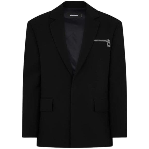 The design features a single-breasted front with a notched lapel, offering a timeless elegance. The blazer is typically fastened with two buttons, which are often branded to subtly highlight the DSQUARED2 identity. The front is adorned with welt pockets, including a chest pocket that adds to its formal appeal. These pockets are both functional and stylish, contributing to the blazer’s clean lines and polished look.