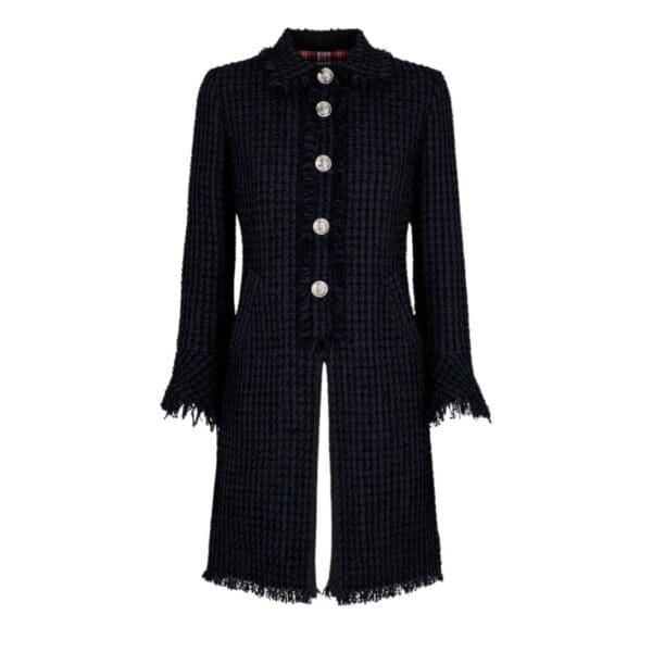 The design features a double-breasted front, a nod to classic tailoring, with a contemporary twist. Large, statement buttons made from high-quality metal or horn add a touch of elegance and practicality, ensuring the coat remains securely fastened. The notched lapels and sharp lines contribute to the coat’s polished appearance, making it suitable for both formal and casual settings.