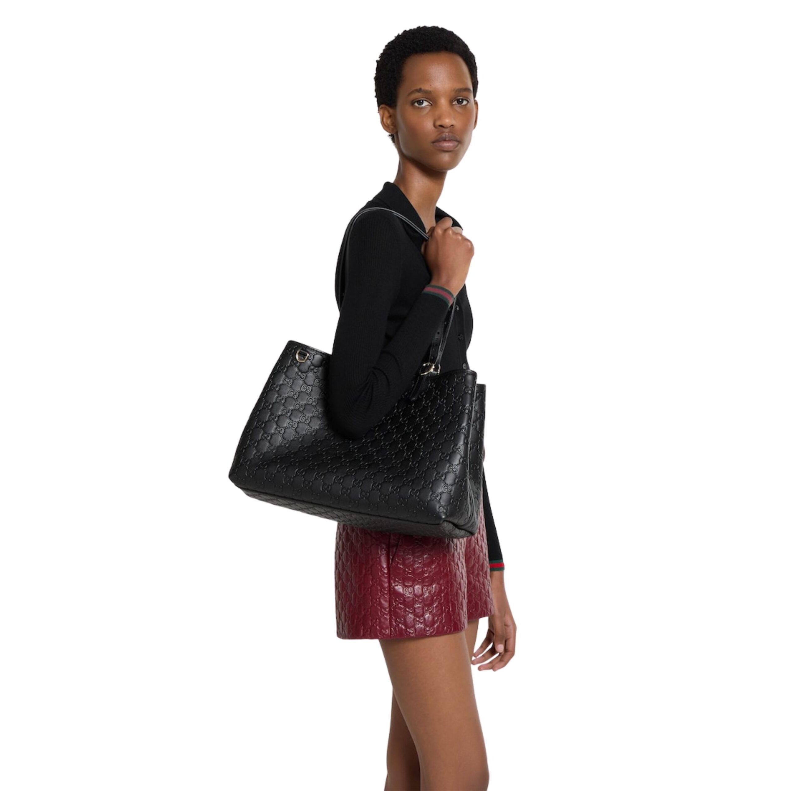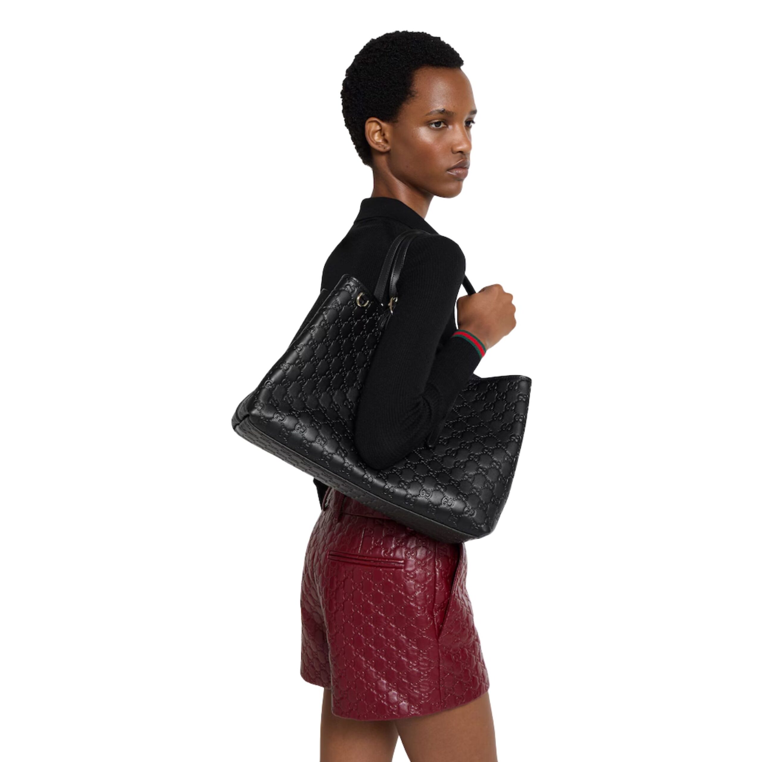 The signature GG emblem adds an iconic touch, reflecting a refined sense of style and unmistakable sophistication. Designed for the modern individual who values both fashion and practicality, this tote bag features sturdy handles for comfortable shoulder or hand carry, allowing effortless versatility. The sleek, structured silhouette complements a wide range of outfits, whether casual, professional, or evening attire, making it a wardrobe staple that transcends trends.