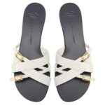 These chic slide Giuseppe Zanotti Alhima Shoes are made from sleek off-white patent leather and feature stylish criss-cross bands. The bands are adorned with small golden metal buckles, adding a touch of sophistication and subtle contrast to the neutral tone.
