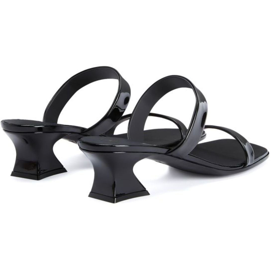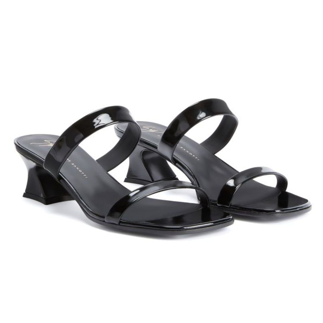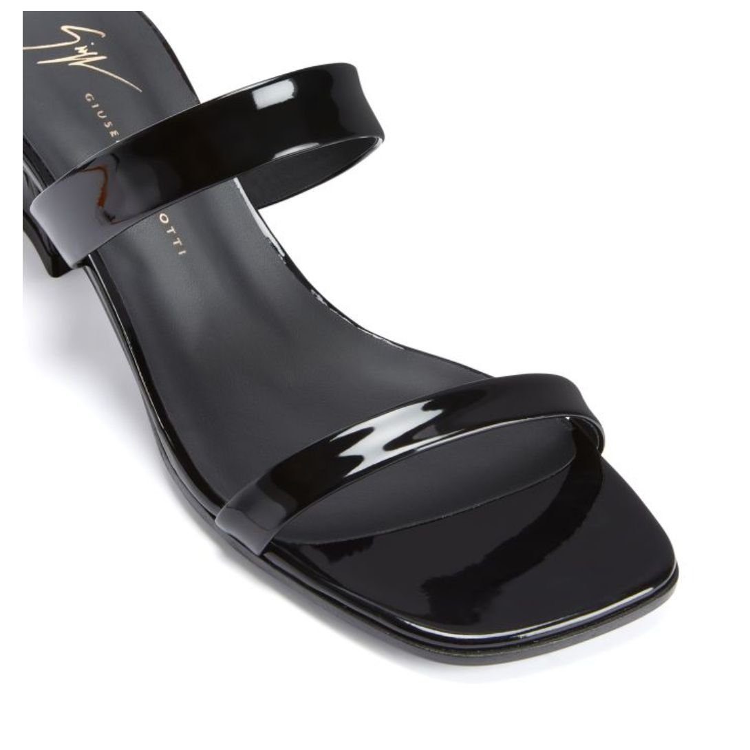 These double-band sandals in black patent-effect fabric, with a kitten heel and square toe, combine elegance and comfort, making them a versatile and stylish addition to any wardrobe.