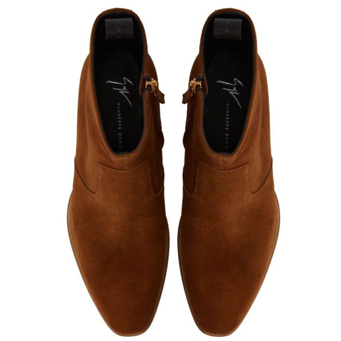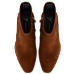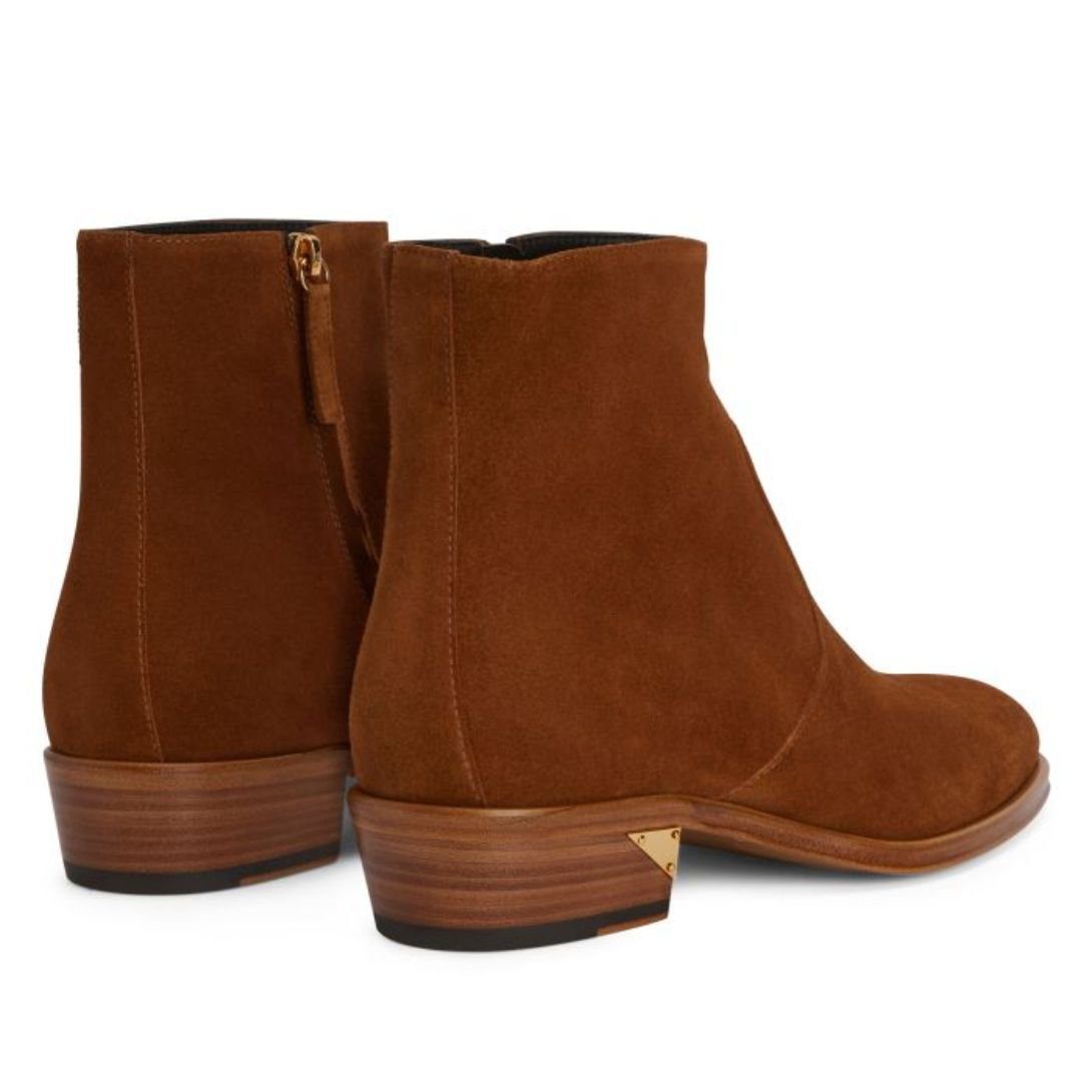 These exquisite ankle Giuseppe Zanotti Fabyen Shoes combine luxurious materials and refined details. Made from brown suede leather, the design is elevated with a golden metal detail on the heel and a black-and-gold zipper fastening on the inner side. A black pull tab with a logo adds practicality and flair, making these boots a statement piece for any wardrobe.