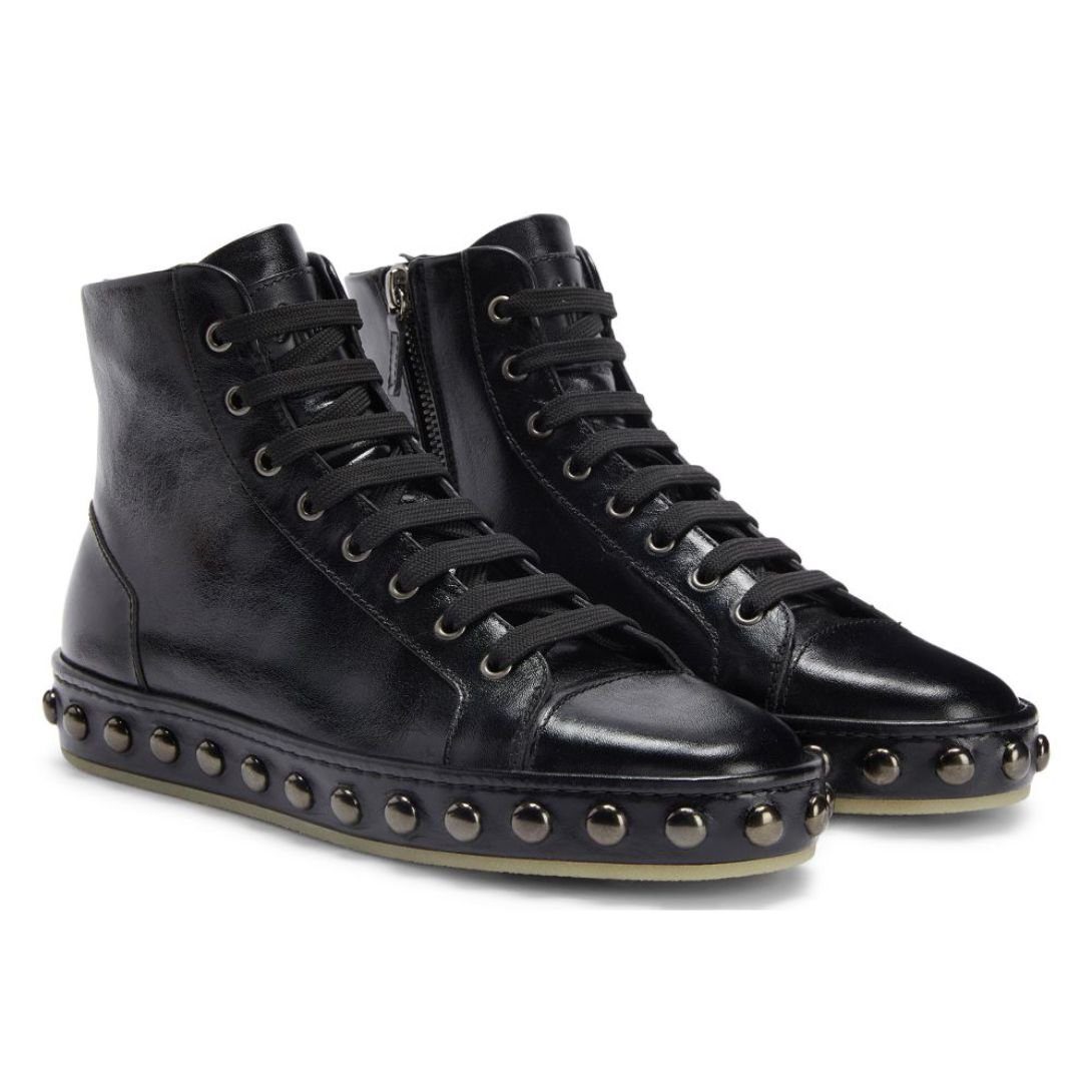 These high-top sneakers are perfect for adding a bold, urban edge to your wardrobe. The combination of leather, metal studs, and sleek details creates a standout piece that is sure to elevate any outfit.