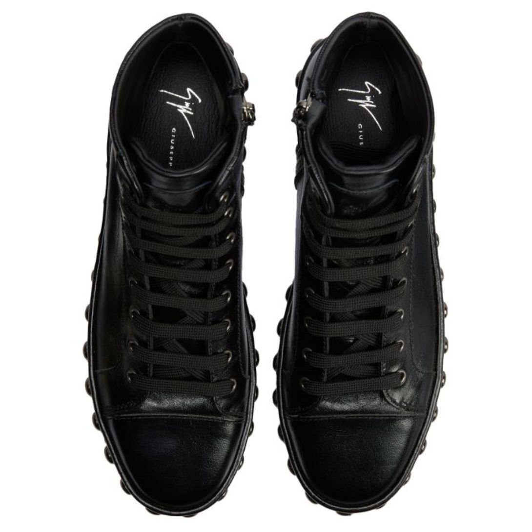 Elevate your footwear collection with these high-top lace-up Giuseppe Zanotti Gz-City Shoes, crafted in Italy from premium black leather. Designed for those who appreciate bold, edgy details, these sneakers feature high-frequency detailing on the label and are accented with gunmetal grey metal stud embroidery along the leather-covered rubber sole for a unique, striking finish.