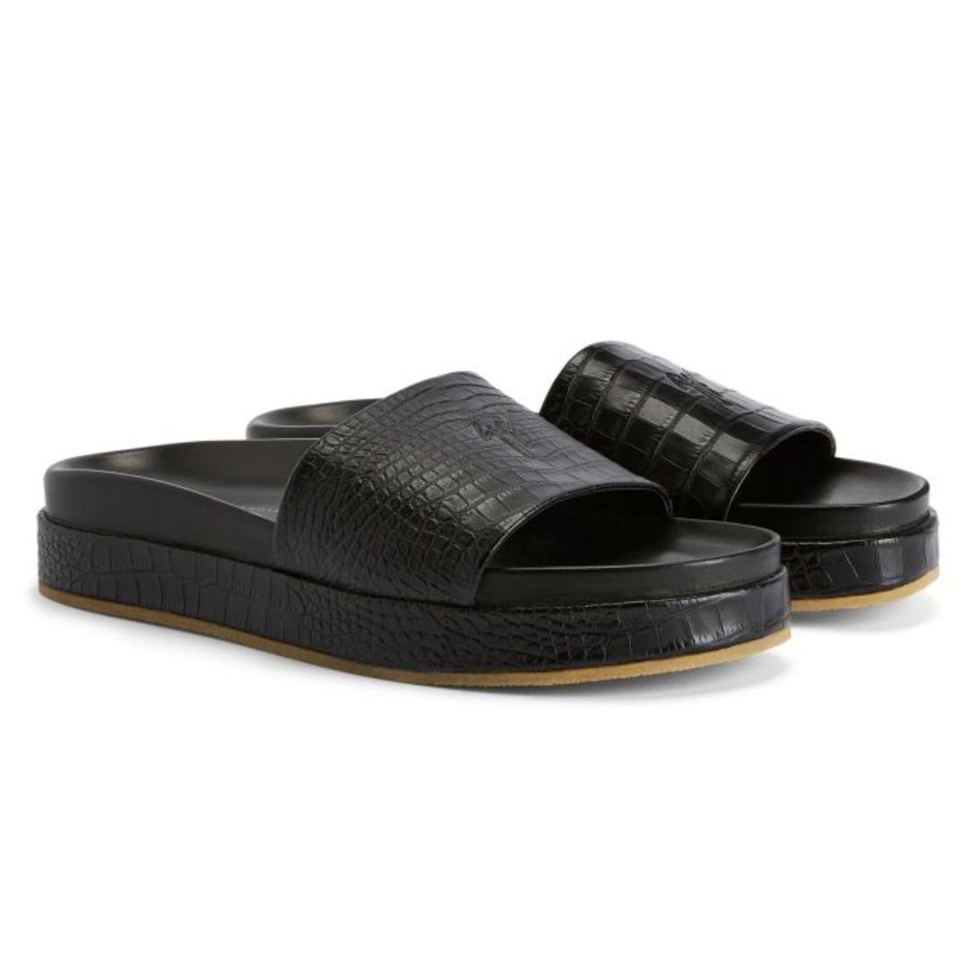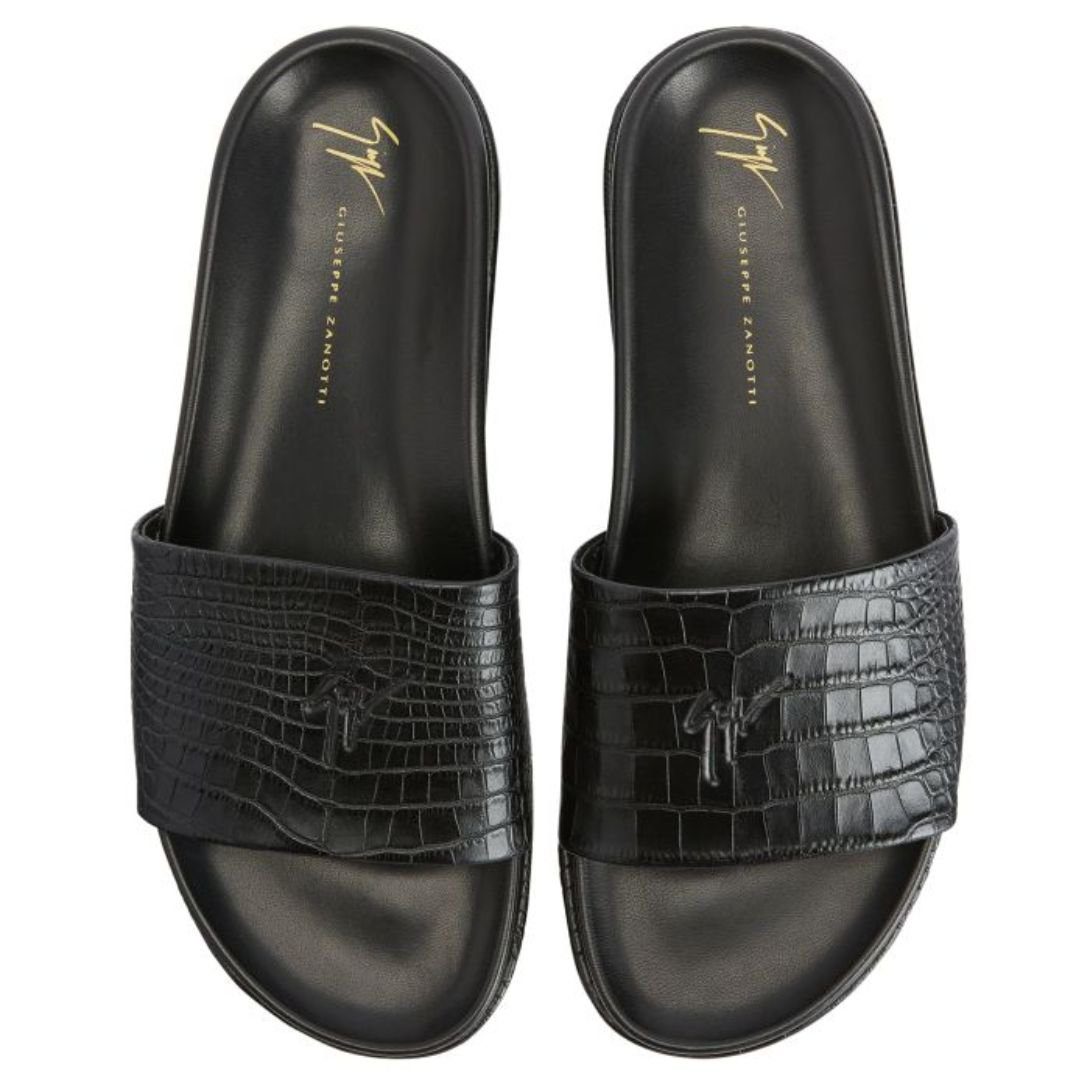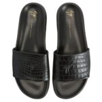 Elevate your casual Giuseppe Zanotti Gz-Indi Shoes collection with these luxurious slides, crafted from crocodile-print black leather. The leather band showcases high-frequency ‘Graffio’ detailing, adding a distinctive texture to the design. The rubber sole, elegantly covered in matching crocodile-print leather, offers both durability and sophistication. Ideal for effortless summer styling with a touch of refinement.