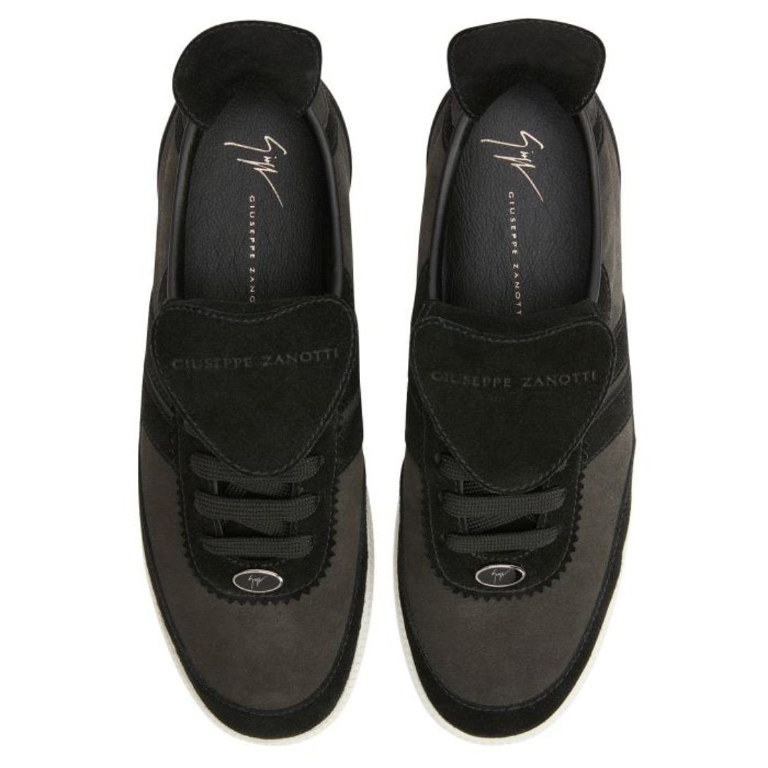 Upgrade your casual footwear collection with these low-top lace-up Giuseppe Zanotti Gz League Shoes, crafted for comfort and style. Made from black and grey suede, the design features a large tongue with a hot-stamped logo for subtle branding. Gunmetal grey and black metal accessories, along with a khaki lace-up, add modern sophistication. The off-white rubber sole ensures durability and everyday practicality.