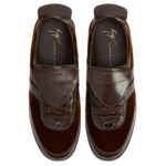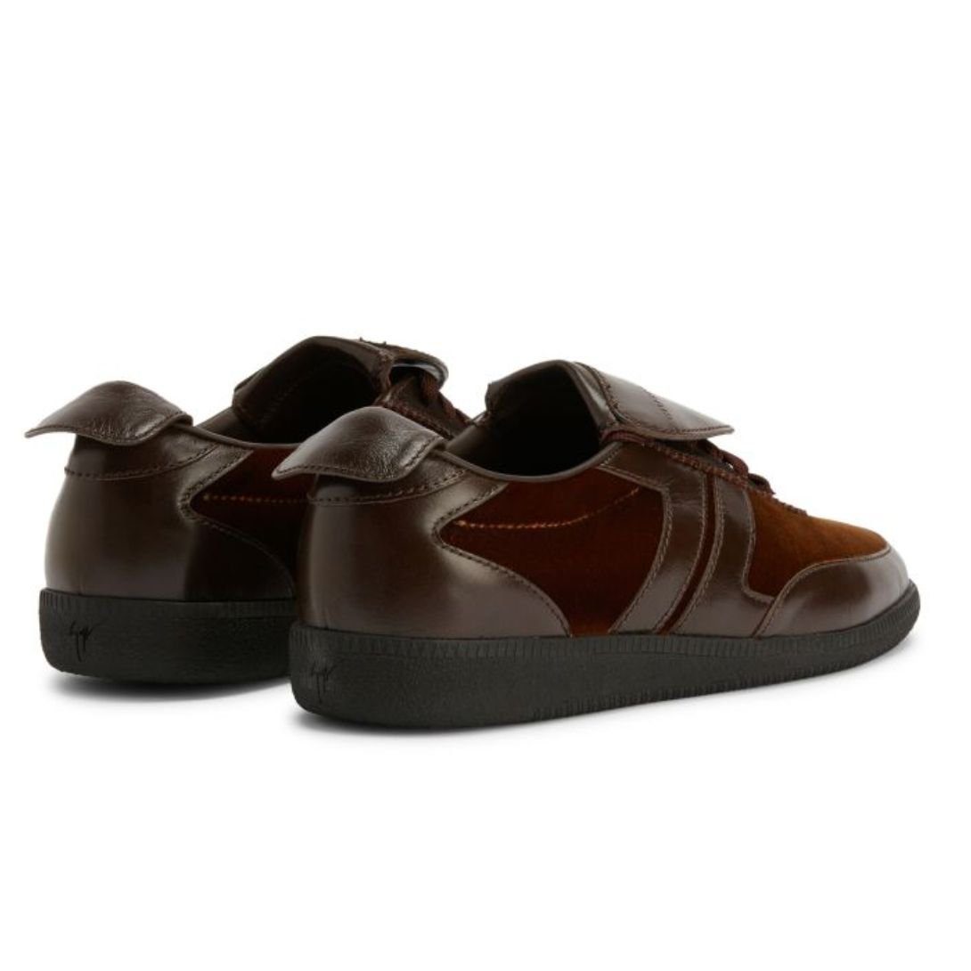 Refined yet contemporary, these low-top Giuseppe Zanotti Gz League Shoes combine the luxurious texture of velvet with the durability of leather. Crafted from brown leather and light brown synthetic velvet, the design features a large tongue adorned with a hot-stamped logo. Gunmetal grey and black metal accents, along with matching brown laces, lend a polished touch, while the black rubber sole ensures comfort and durability.