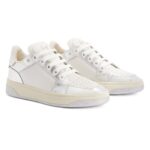 Crafted from a combination of white leather, silver laminated leather, and silver mirror-effect synthetic fabric, these low-top Giuseppe Zanotti Gz94 Shoes exude modern elegance. The silver hot-stamped ‘Signature’ detail on the tongue and silver debossed ‘Logo Lettering’ on the back add a refined touch of luxury. Rubberised eyelets and matching white cotton laces enhance the sleek and polished aesthetic.