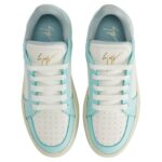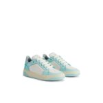 These low-top Giuseppe Zanotti Gz94 Shoes are crafted from a refined combination of white leather, light-blue leather, and light-blue patent leather, offering a soft and refreshing design. The golden hot-stamped ‘Signature’ on the tongue and the golden ‘Logo Lettering’ print on the back of the upper add an elegant touch. White cotton laces and light-blue rubberised eyelets complement the design, creating a cohesive, stylish look.