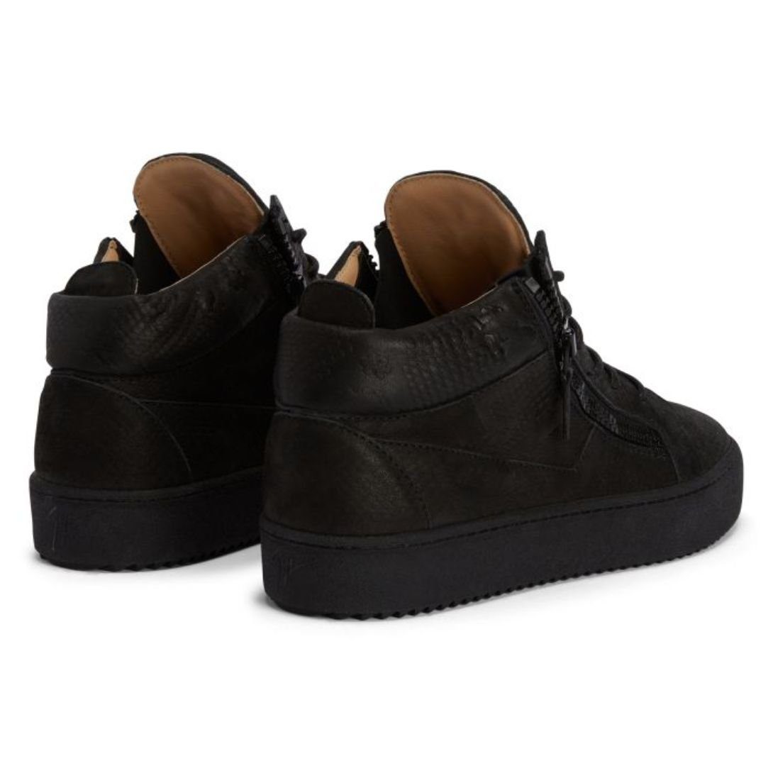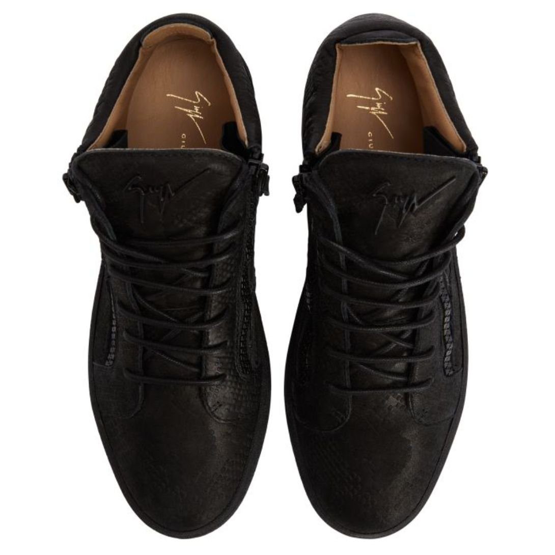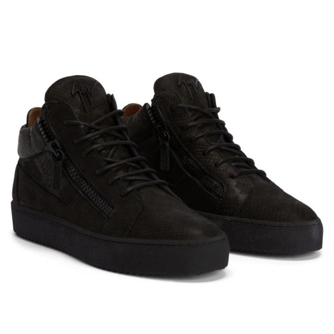 These mid-top Giuseppe Zanotti Kriss Shoes are crafted from luxurious python-print black nubuck, combining bold texture with a sleek monochromatic design. The tongue features a black rubberised ‘Signature’ detail, while functional black plastic side zippers add a modern edge. A matching black rubber sole completes the look, offering durability and style.