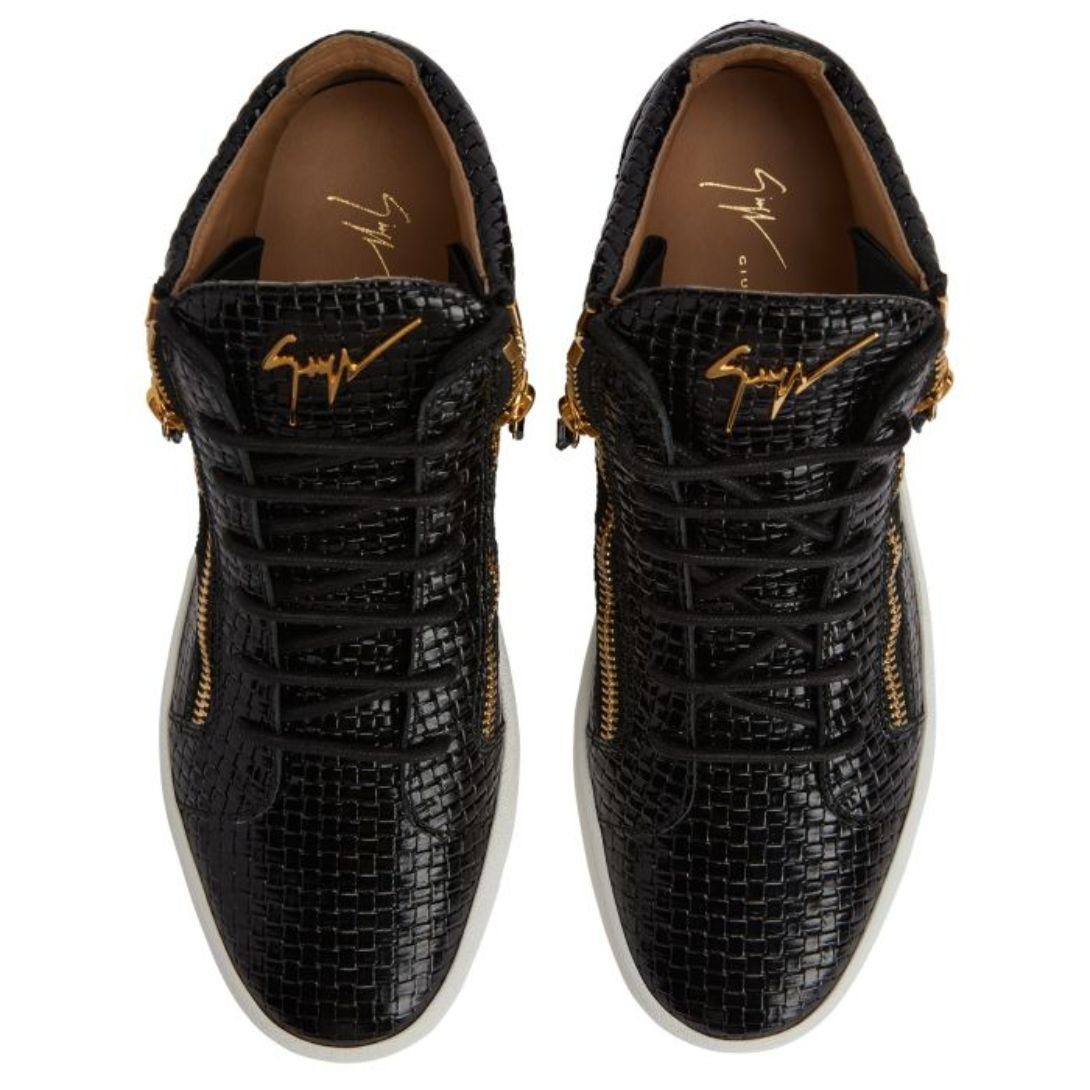 Exuding a refined yet contemporary charm, these mid-top Giuseppe Zanotti Kriss Shoes are crafted from glossy black woven leather, offering a sleek texture and unique design. The tongue showcases a golden metal ‘Signature’ detail, while matching golden side zippers enhance their bold appeal. A contrasting white rubber sole ensures both style and comfort, making these sneakers a versatile addition to your wardrobe.