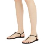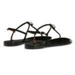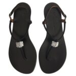 Exuding understated elegance, these flat thong Giuseppe Zanotti Maryland Shoes are crafted from black suede and feature delicate thin straps. A central embellishment with crystal-colored rhinestones adds a sparkling focal point, while a silver-toned metal buckle on the adjustable ankle strap ensures a secure and stylish fit.