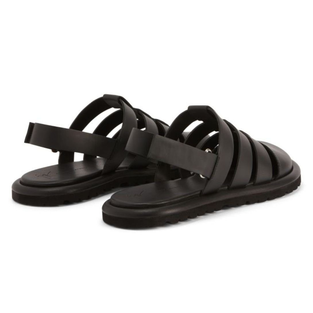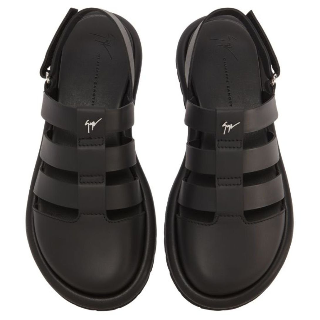 Step into understated elegance with these flat cage Giuseppe Zanotti Rusery Shoes, meticulously crafted from black leather. Featuring a sleek silver metal ‘Signature’ detail and matching hardware, these sandals combine luxury with practicality. The adjustable Velcro strap closure ensures a secure fit, while the 10 mm black leather sole offers a sophisticated, minimalist finish. Perfect for both casual and elevated summer looks.