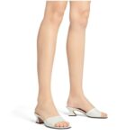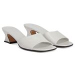 These white leather sandals, with their minimalist upper and covered kitten heel, offer a timeless and chic look that pairs effortlessly with both casual and more formal outfits.