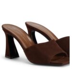 These brown suede mules with an open square toe and spool heel offer timeless elegance with a modern twist, making them a versatile addition to both casual and formal wardrobes.