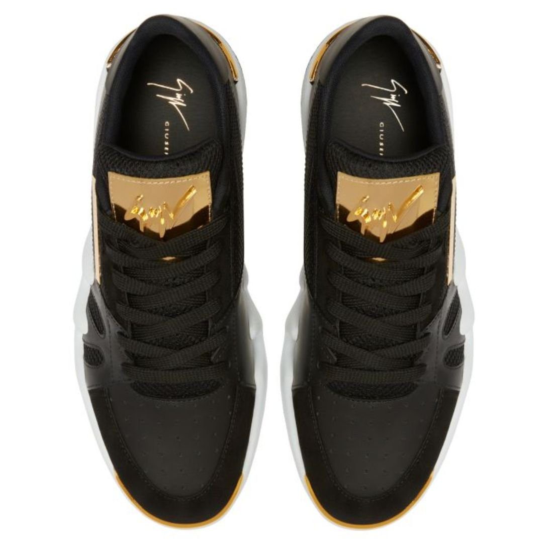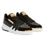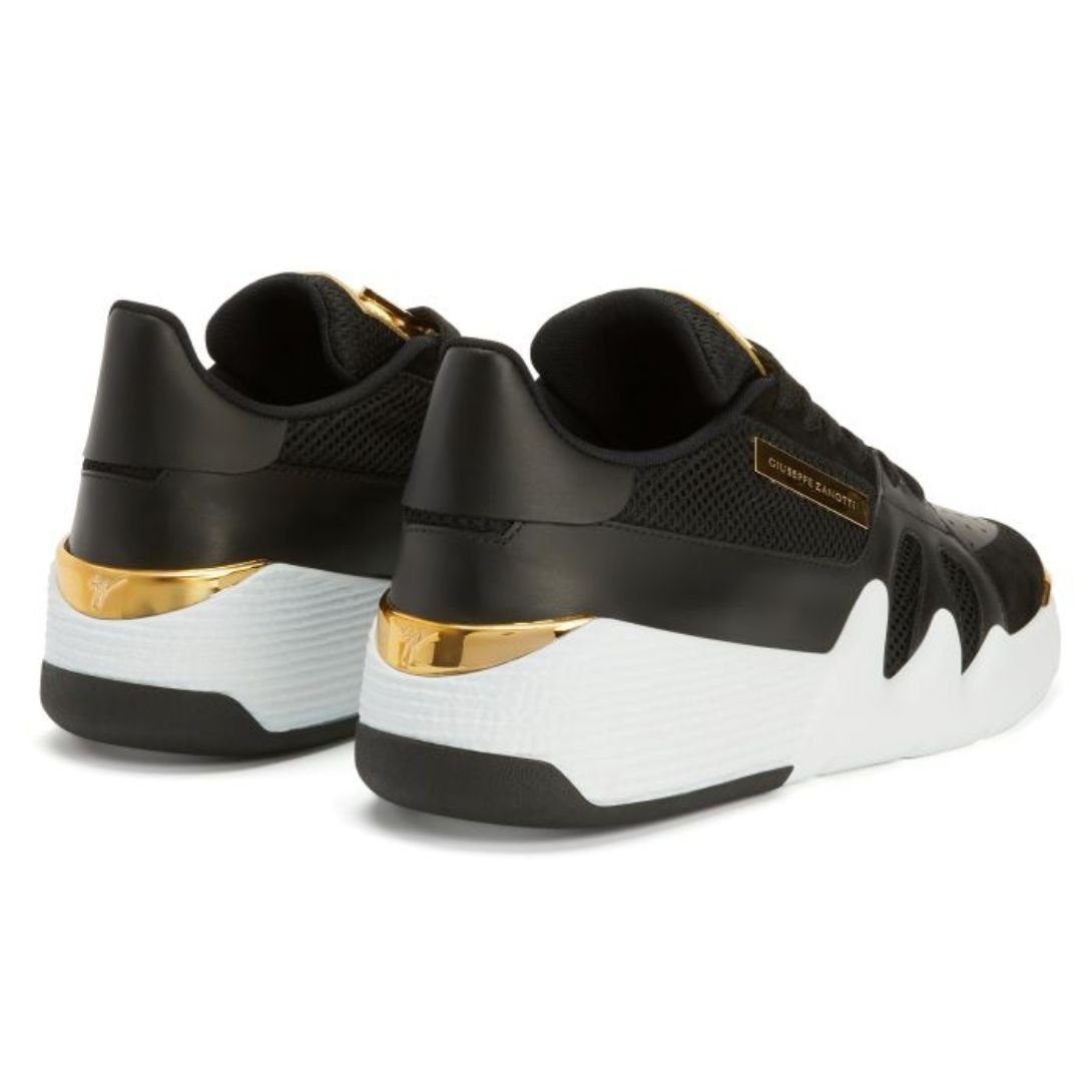 These luxurious mid-top ‘Talon’ Giuseppe Zanotti Talon Shoes are crafted from a blend of black leather, velour, and synthetic mesh fabric, offering a rich texture and sleek finish. Featuring golden metal ‘Signature’ hardware on the tongue and a matching ‘Label Signature’ on the outer side, the sneakers exude premium sophistication. A white rubber sole with golden chromed spoilers and accents adds a striking contrast, while the black technical fabric inner lining ensures comfort.