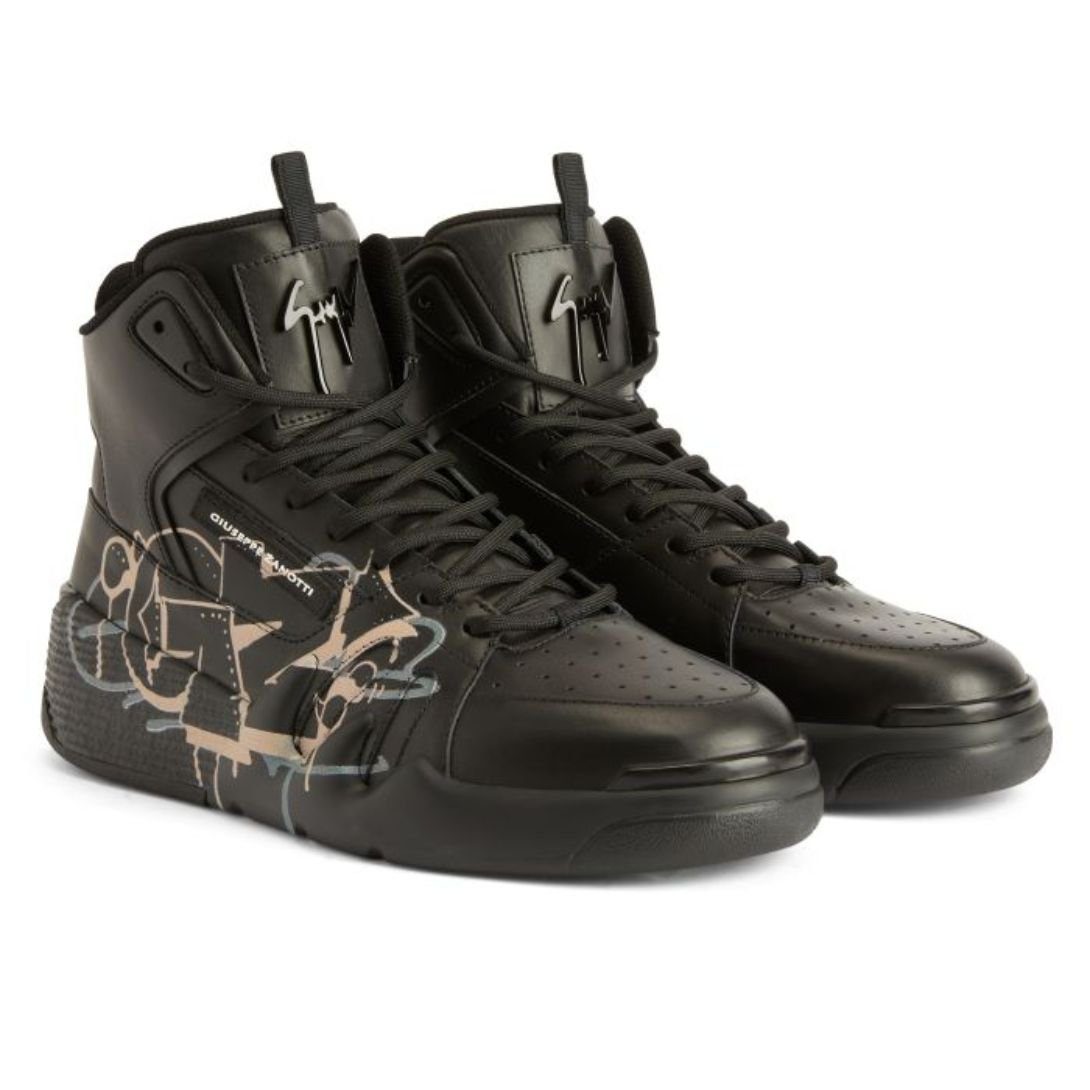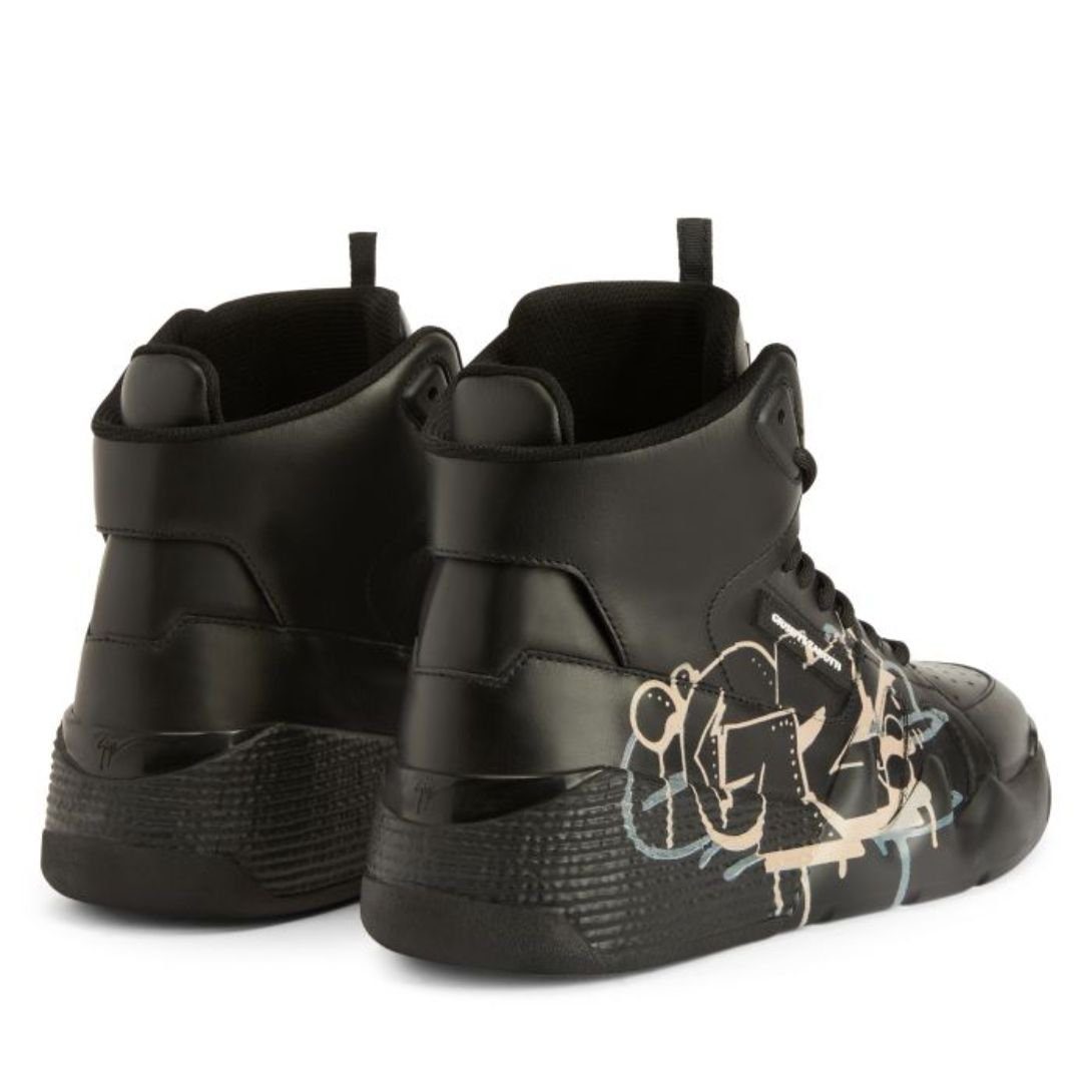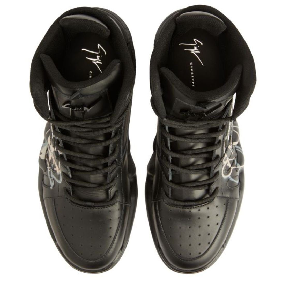 These high-top ‘Talon’ Giuseppe Zanotti Talon Shoes blend artistic flair with a sleek design, crafted from premium black leather and detailed with a unique black, beige, and grey graffiti-style finish on the upper. A black lacquered metal ‘Signature’ adorns the tongue, while a rubberized ‘Label Signature’ accent enhances the outer side. The design is completed with a matching black rubber sole for a streamlined look, while the technical fabric inner lining ensures comfort.