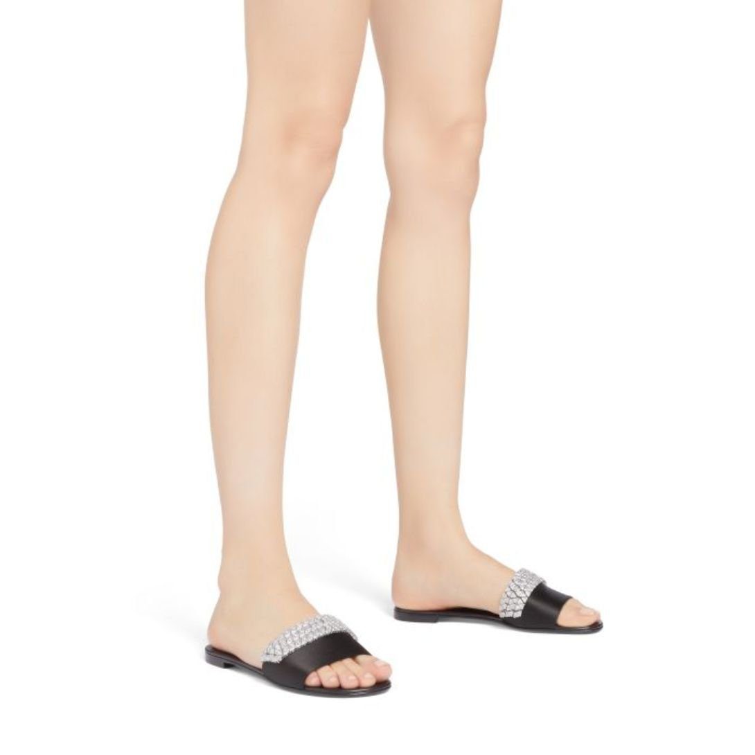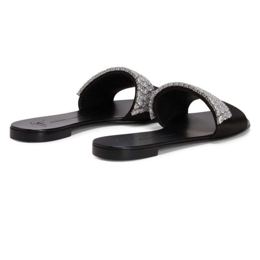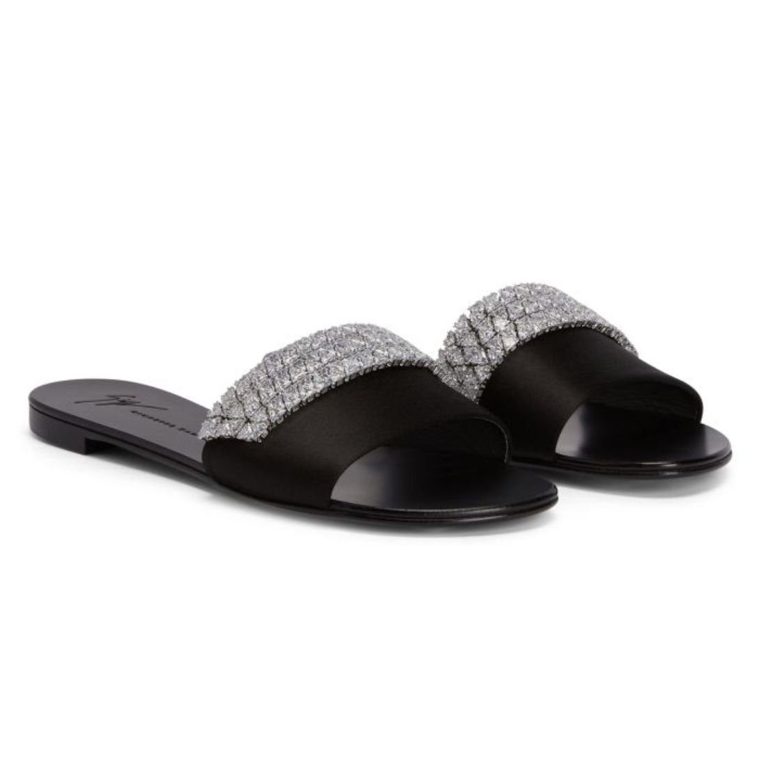 Sophisticated and sleek, these Giuseppe Zanotti Tesy Shoes are crafted from black synthetic fabric with a luxurious satin effect. The wide band is adorned with silver-toned metal hardware, embellished with crystal-colored rhinestones for a glamorous touch.