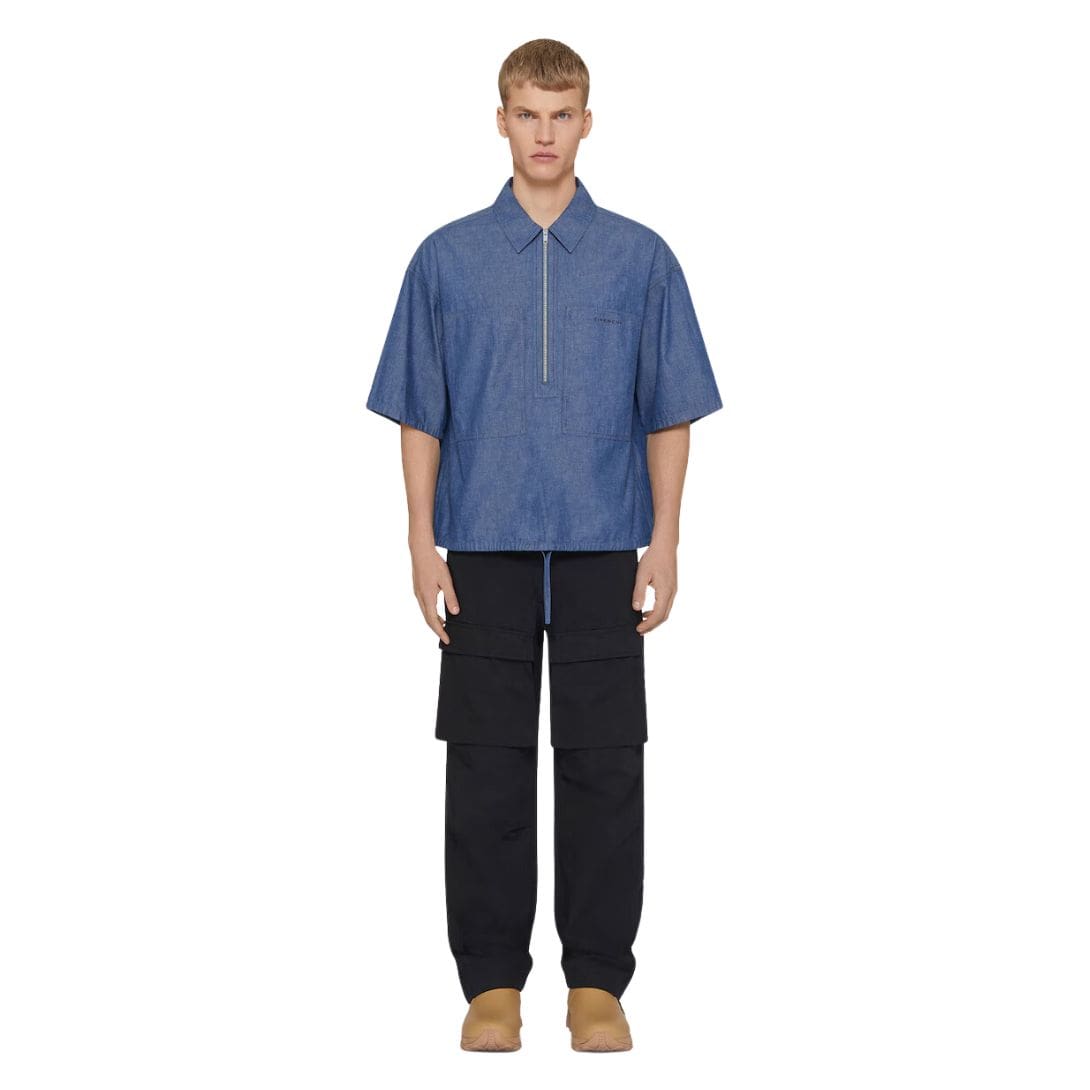 Designed with meticulous attention to detail, the overshirt features a relaxed yet tailored fit that flatters the silhouette. Its structure includes a classic spread collar, adding a touch of formality that makes it suitable for both casual and semi-formal occasions. The front of the shirt is adorned with a button-down closure, featuring high-quality buttons engraved with the Givenchy logo, underscoring the brand’s commitment to luxury and refinement. GIVENCHY OVERSHIRT IN DENIM CHAMBRAY