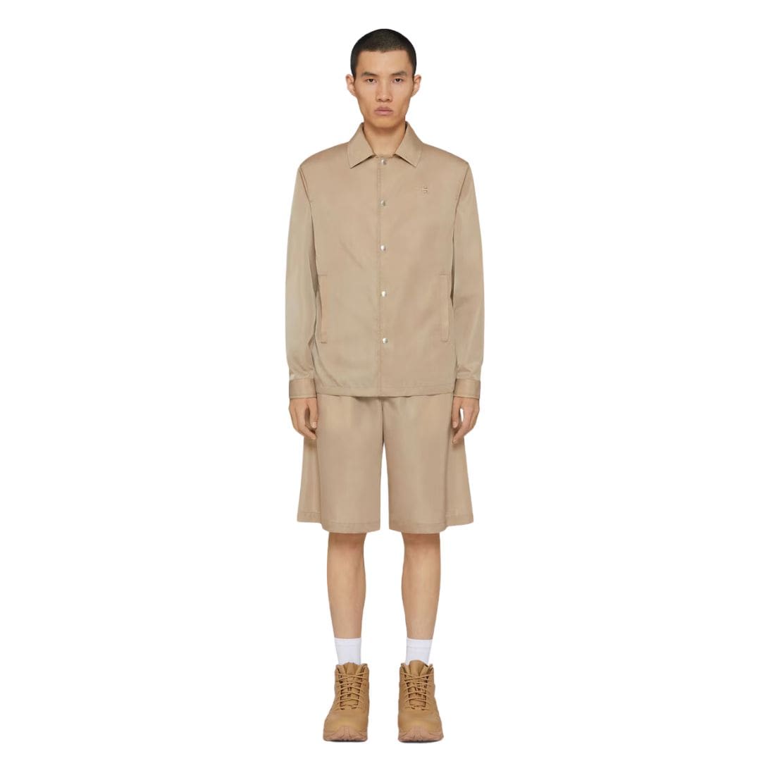Featuring a classic button-down front, the overshirt is versatile enough to be worn open over a tee or buttoned up for a more polished look. The collar is designed with a modern twist, often featuring a sleek, minimalistic cut that enhances the shirt’s clean lines. The cuffs are adjustable, providing a customizable fit, while the tailored sleeves ensure a streamlined appearance. Two chest pockets with flap closures add functionality and a nod to traditional workwear aesthetics. GIVENCHY OVERSHIRT WITH 4G DETAIL