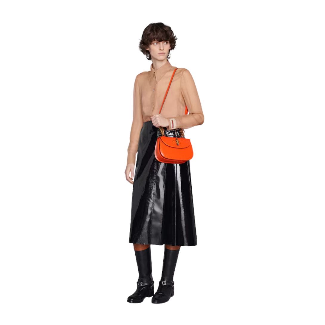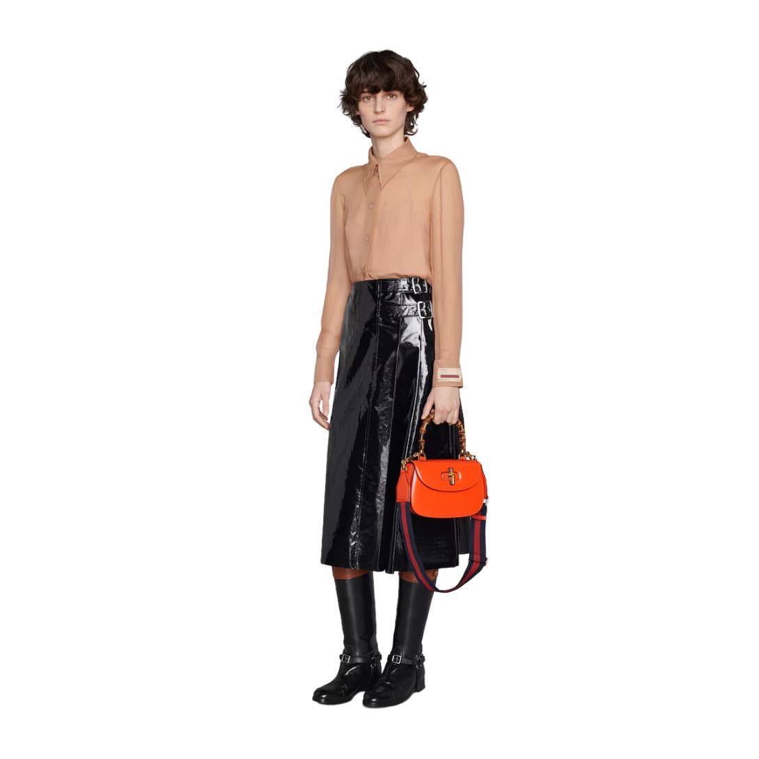 The standout feature of this bag is the bamboo handle, which is meticulously hand-shaped and polished to perfection. The use of bamboo not only adds an exotic flair but also pays homage to Gucci’s rich heritage and innovative spirit. This distinctive handle provides a unique contrast to the leather body, creating a harmonious blend of natural and refined elements.