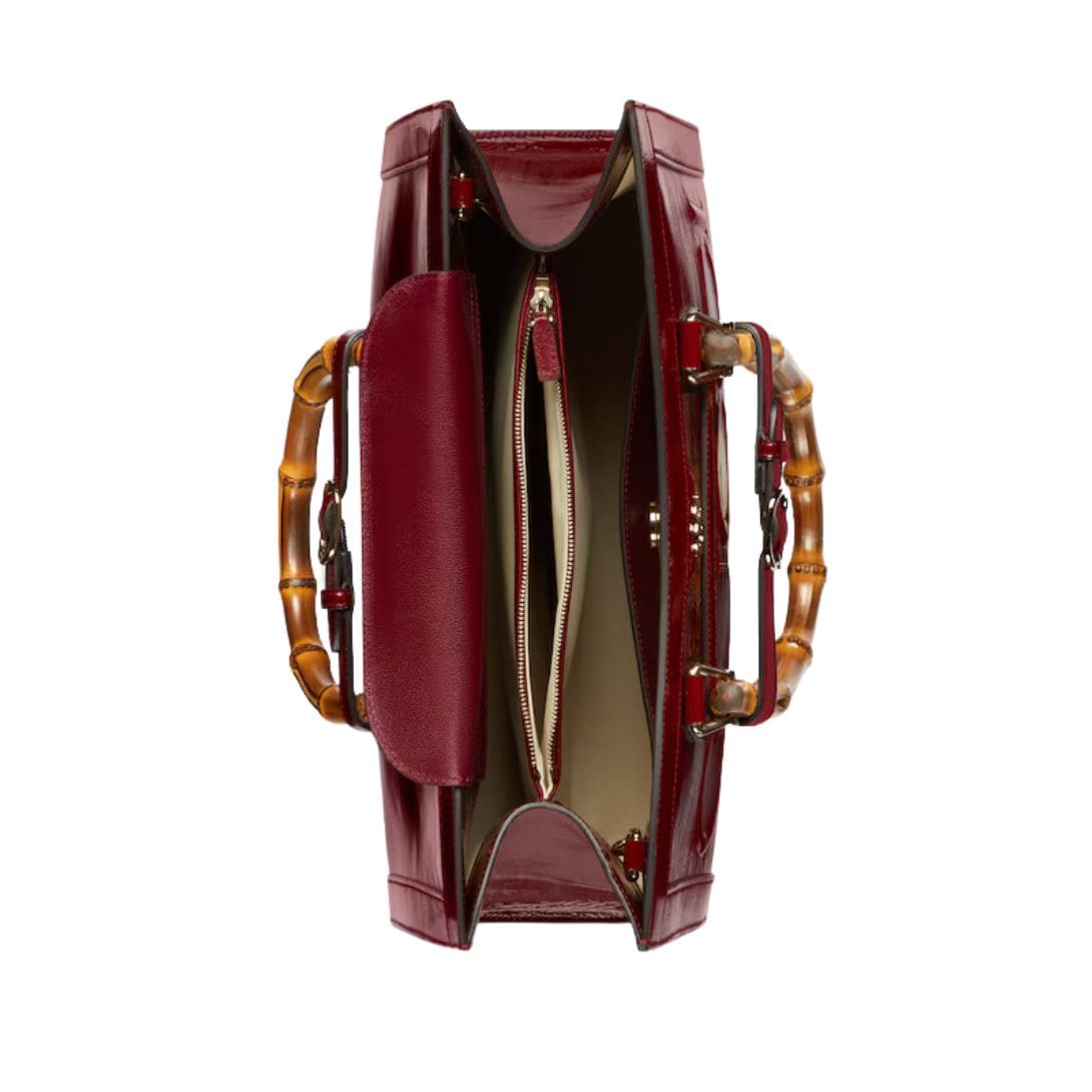 The tote’s design pays homage to Gucci’s heritage, featuring the iconic bamboo handles that have become a signature of the brand. These handles, meticulously crafted from sustainable bamboo, are not only visually striking but also durable and ergonomically designed for comfortable carrying. The bamboo adds a touch of natural charm, seamlessly integrating with the leather body for a harmonious blend of materials.