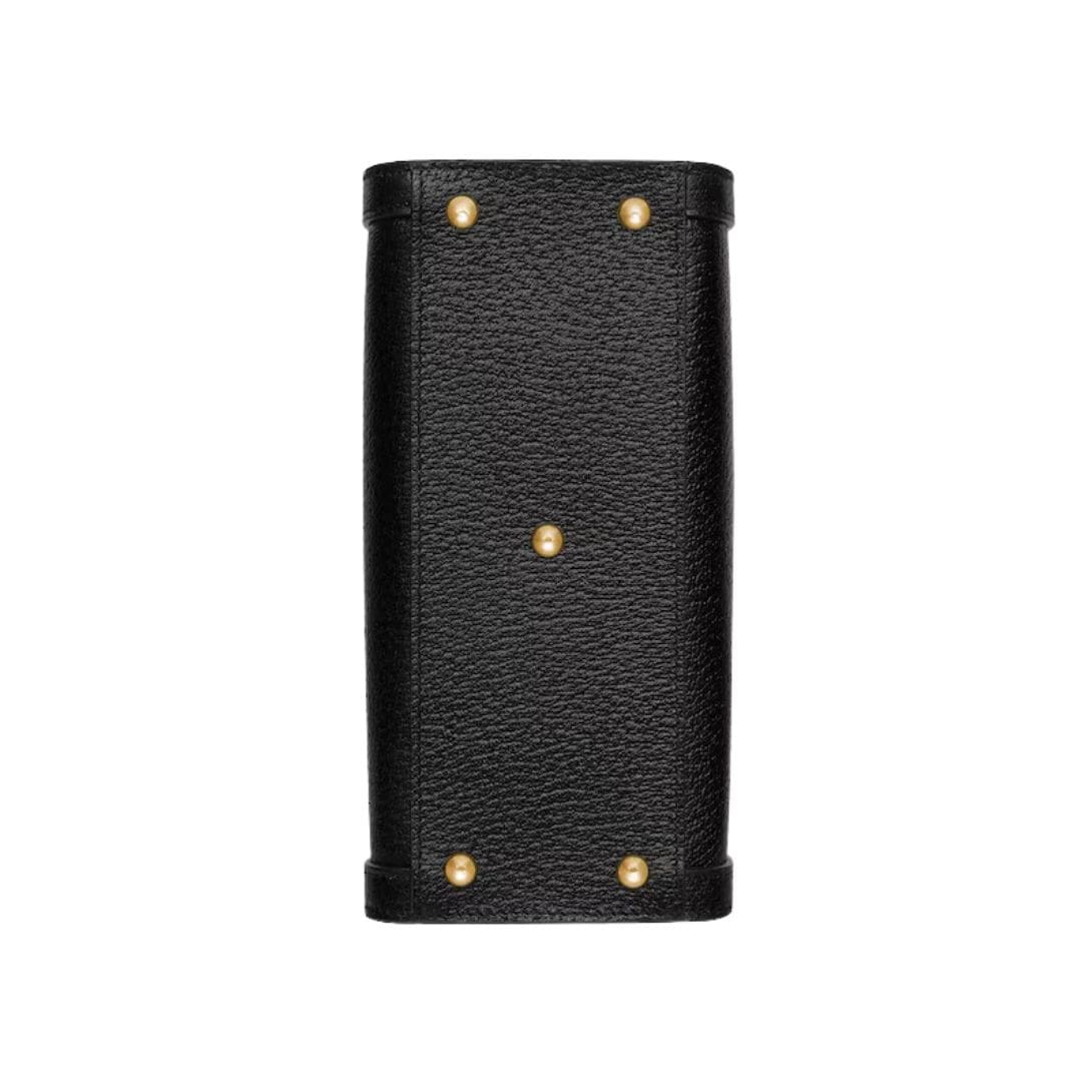 The bag’s design is further enhanced by its gold-toned hardware, which includes the signature double G logo prominently displayed on the front. This logo serves as a testament to Gucci’s rich heritage and commitment to quality. The interior of the bag is thoughtfully designed to maximize space despite its mini size. It features a single compartment lined with soft microfiber fabric, complete with a zip pocket and open pockets to keep essentials organized and easily accessible.