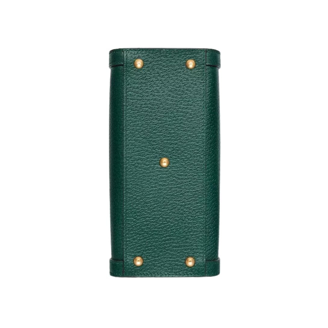 The bag’s design is further enhanced by its gold-toned hardware, which includes the signature double G logo prominently displayed on the front. This logo serves as a testament to Gucci’s rich heritage and commitment to quality. The interior of the bag is thoughtfully designed to maximize space despite its mini size. It features a single compartment lined with soft microfiber fabric, complete with a zip pocket and open pockets to keep essentials organized and easily accessible.