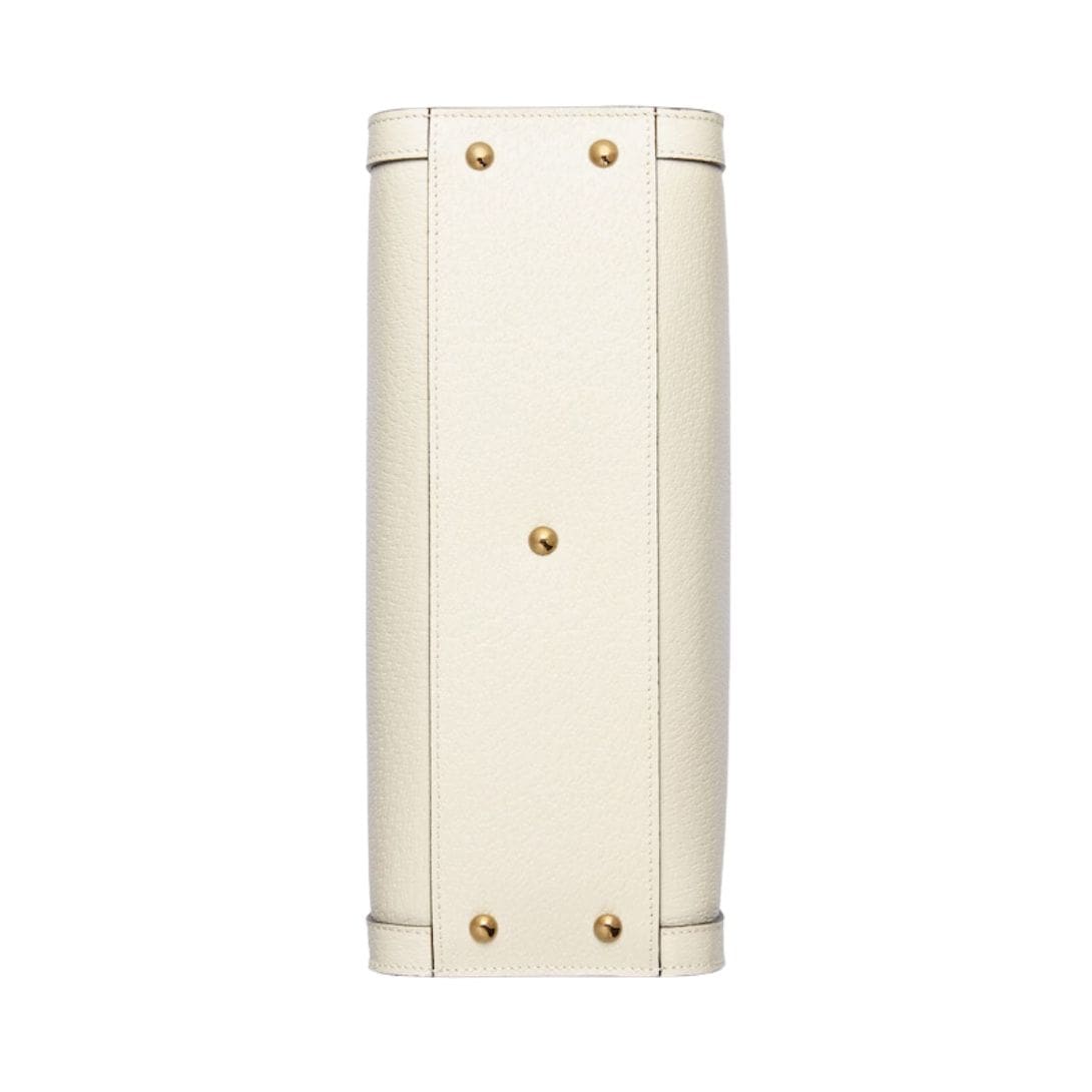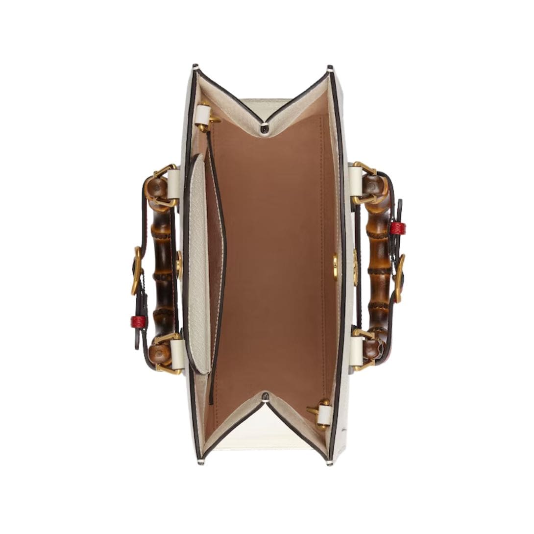 The design of the Gucci Diana Small Tote Bag is a modern reinterpretation of the classic bamboo handle bag, first introduced by the brand in the 1940s. The most distinctive feature of this tote is its bamboo handles, which have been a symbol of Gucci’s craftsmanship and creativity for decades. These handles are meticulously hand-burnished by skilled artisans, resulting in a unique, natural finish that adds an organic touch to the sophisticated silhouette of the bag.