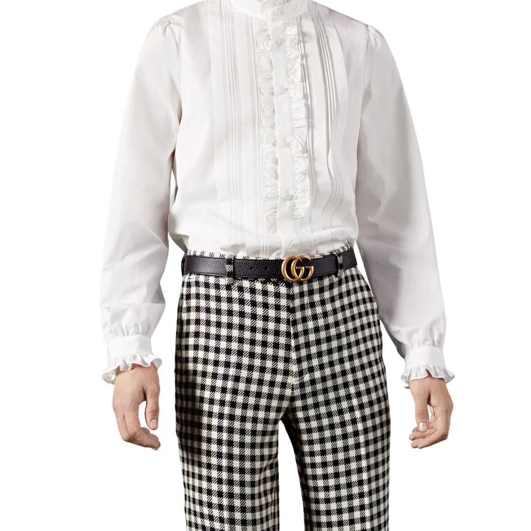 Accentuating this belt’s allure is the aged gold-toned hardware, including the signature Double G buckle, a hallmark of our commitment to exquisite detailing and heritage-inspired design. This emblematic adornment serves as a testament to the enduring legacy of the GG Marmont collection, elevating this accessory to a coveted symbol of luxury and refinement.