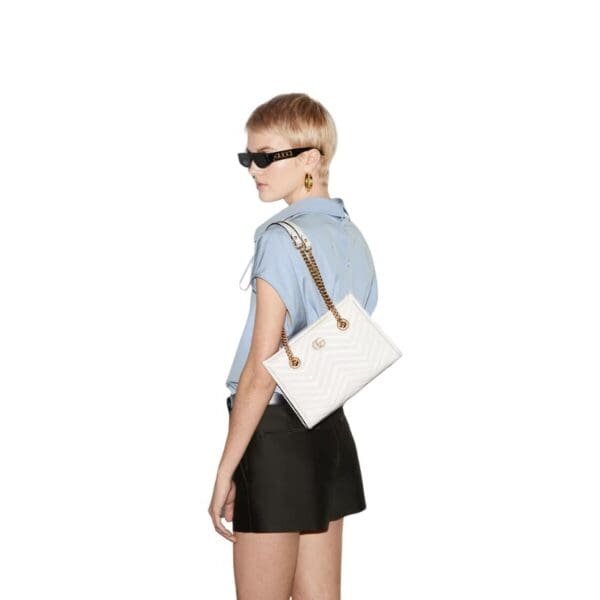 The small tote features a top handle, also crafted from quilted leather, allowing for comfortable and versatile carrying options. Additionally, the bag includes a detachable chain shoulder strap with a leather shoulder pad, providing the flexibility to wear it as a crossbody or over the shoulder. GUCCI GG MARMONT SMALL TOTE