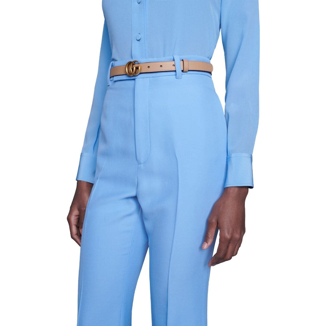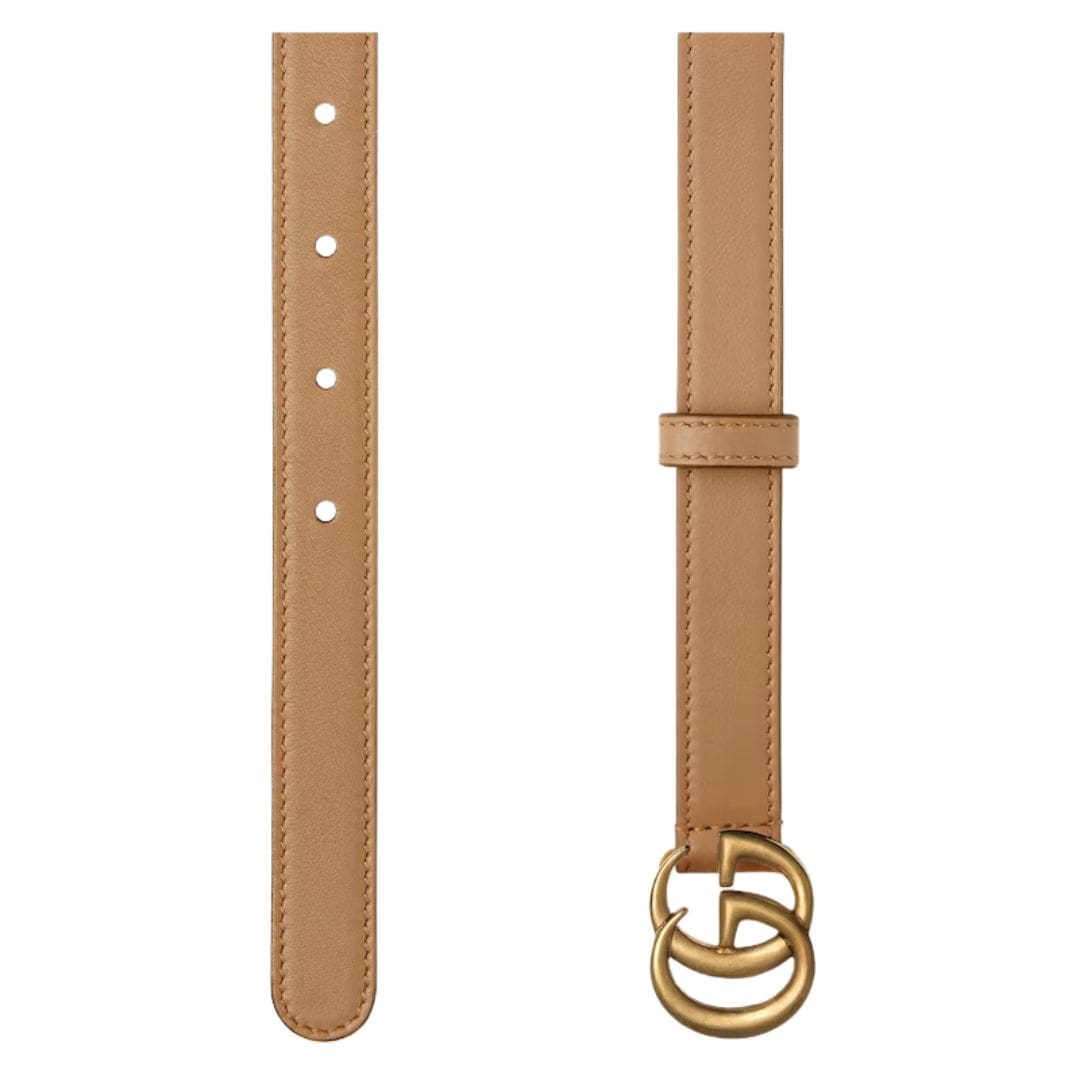 At the heart of our ethos lies a steadfast commitment to timeless elegance and unparalleled craftsmanship. Embodying this dedication, our Spring Summer 2020 collection proudly reintroduces the iconic Double G emblem, bathed in a resplendent gold-tone hue, adorning a slender  Gucci GG Marmont Thin Belt tailored for the modern woman.