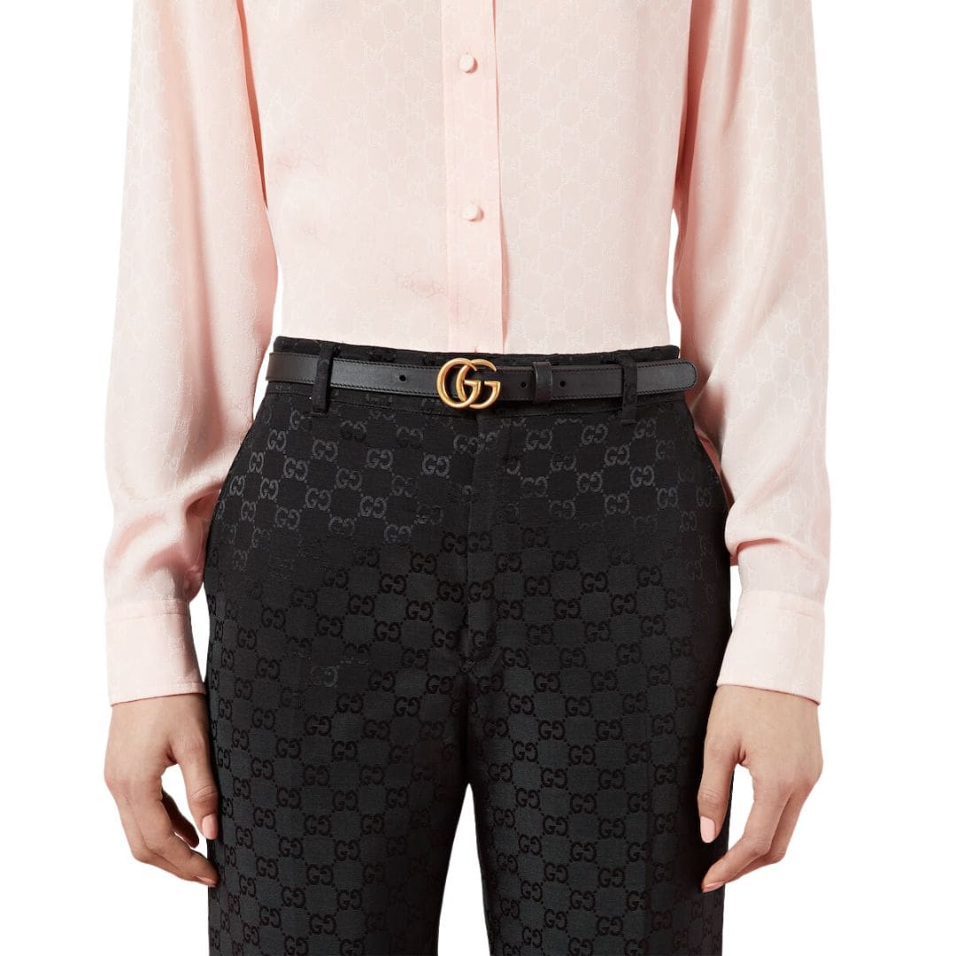 At the heart of our ethos lies a steadfast commitment to timeless elegance and unparalleled craftsmanship. Embodying this dedication, our Spring Summer 2020 collection proudly reintroduces the iconic Double G emblem, bathed in a resplendent gold-tone hue, adorning a slender  Gucci GG Marmont Thin Belt tailored for the modern woman.