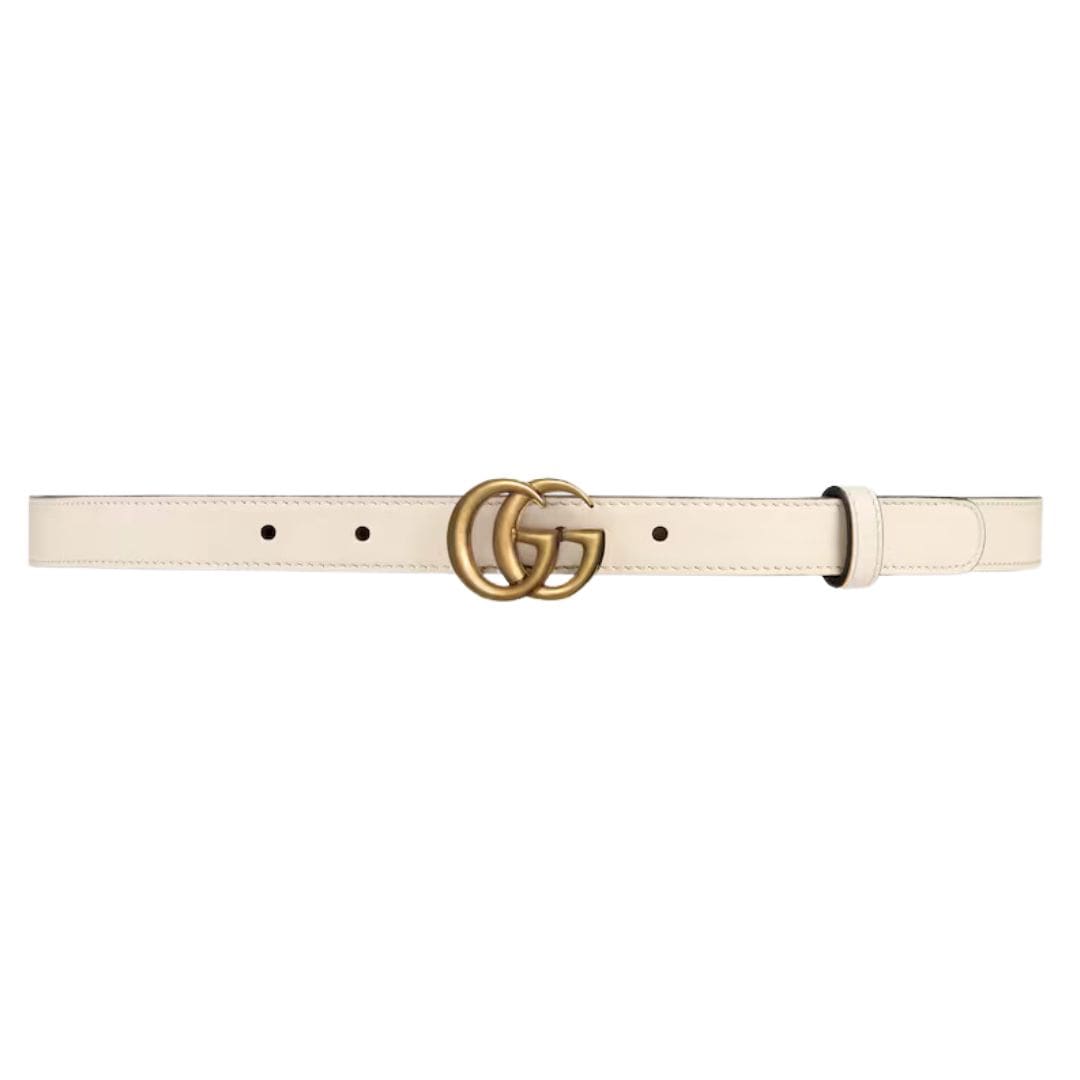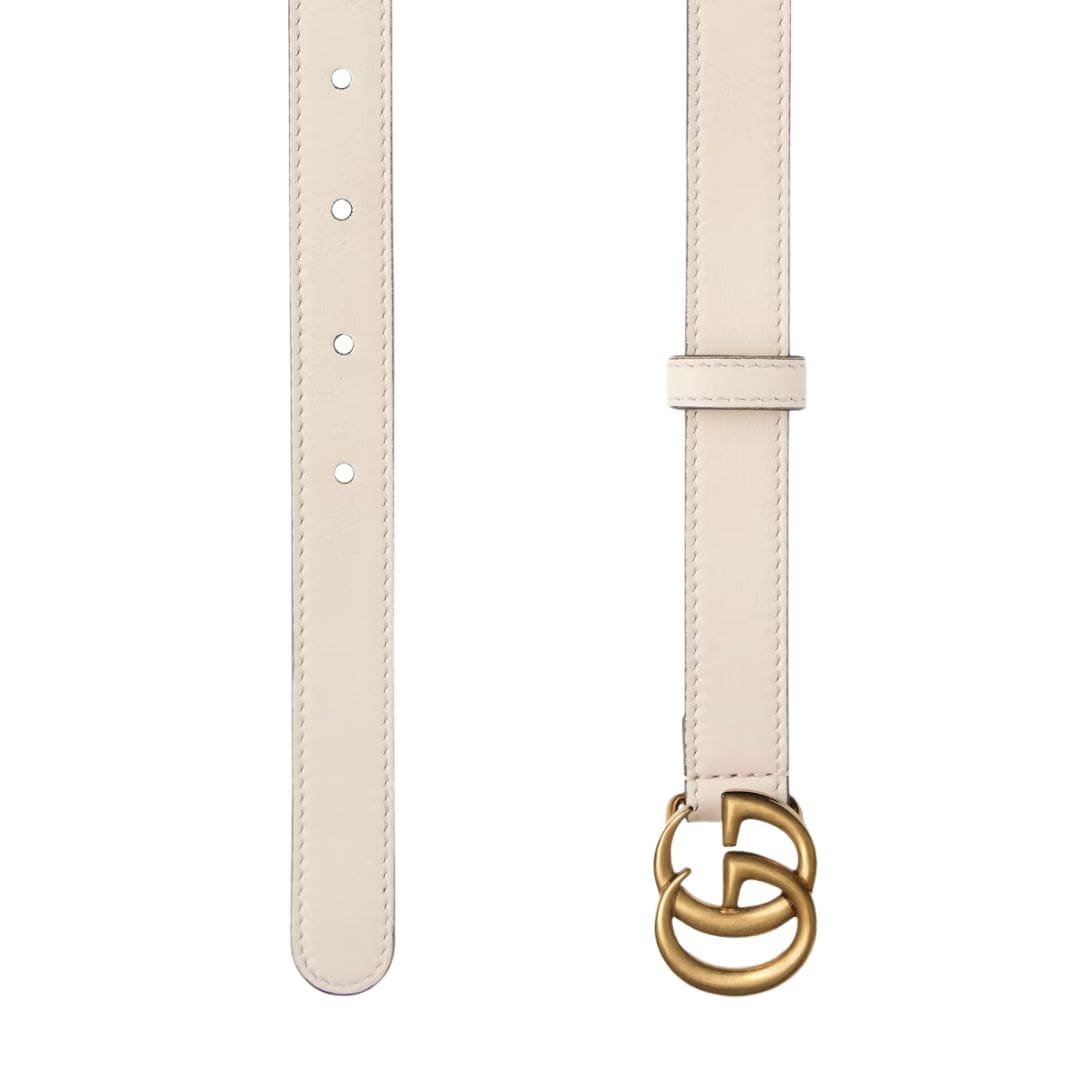 At the heart of our ethos lies a steadfast commitment to timeless elegance and unparalleled craftsmanship. Embodying this dedication, our Spring Summer 2020 collection proudly reintroduces the iconic Double G emblem, bathed in a resplendent gold-tone hue, adorning a slender  Gucci GG Marmont Thin Belt tailored for the modern woman.
