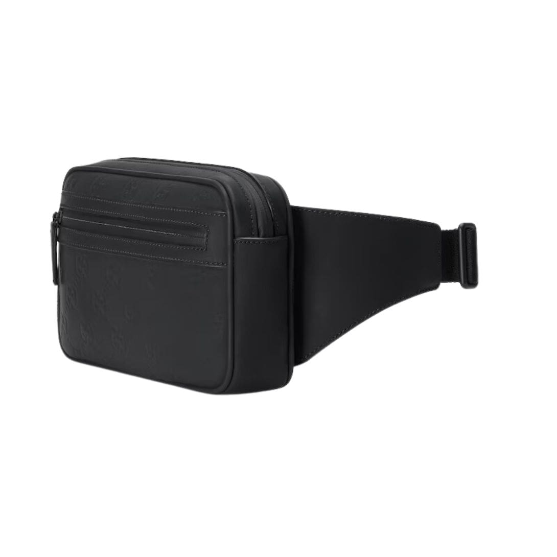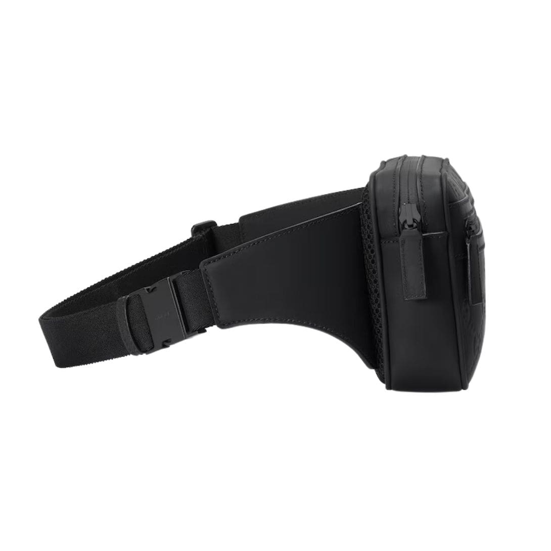 The belt bag is designed for both functionality and comfort. It features an adjustable strap that allows for a customizable fit, enabling it to be worn around the waist or slung across the body. This versatility makes it a practical choice for those on the go, offering hands-free convenience without compromising style. GUCCI GG RUBBER-EFFECT BELT BAG IN BLACK