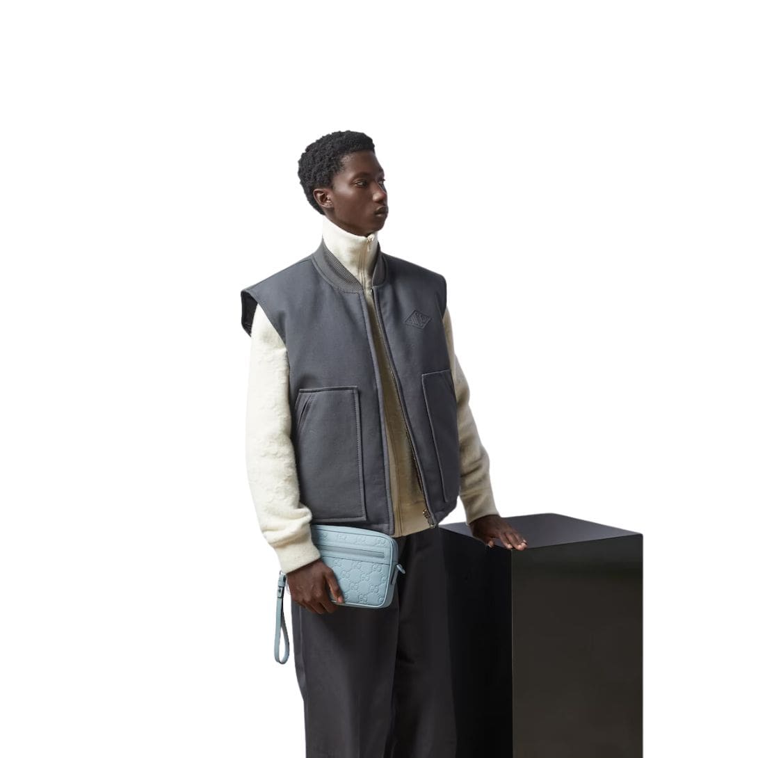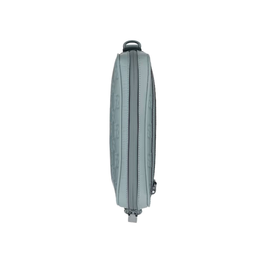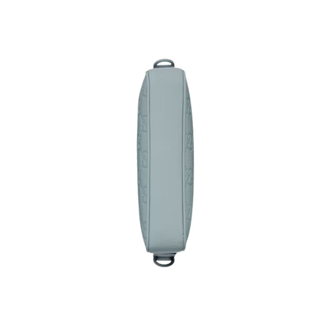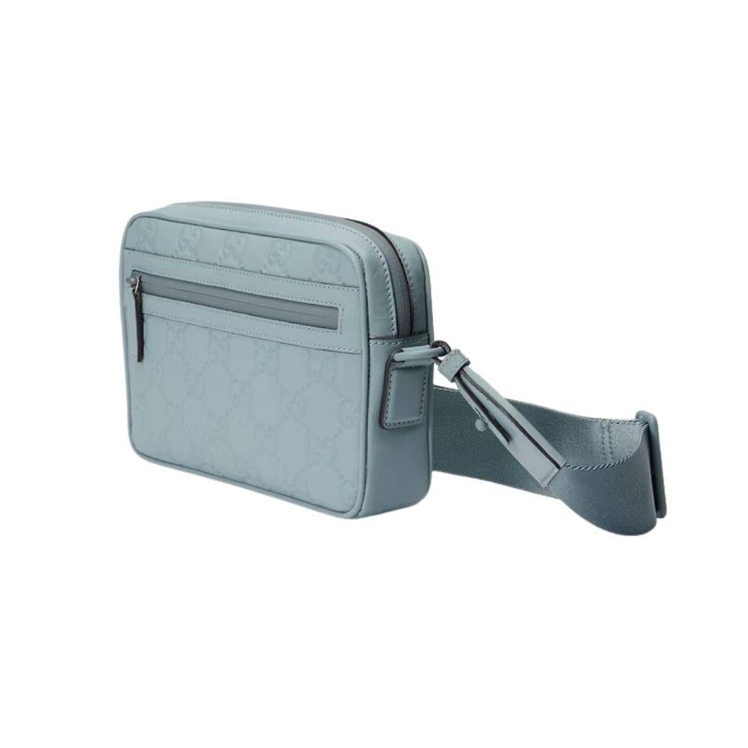 A long, adjustable shoulder strap allows for comfortable crossbody wear, making it an ideal choice for hands-free convenience. The strap is also detachable, offering the flexibility to carry the bag as a clutch for a more elegant look. GUCCI GG RUBBER EFFECT CROSSBODY BAG IN LIGHT BLUE