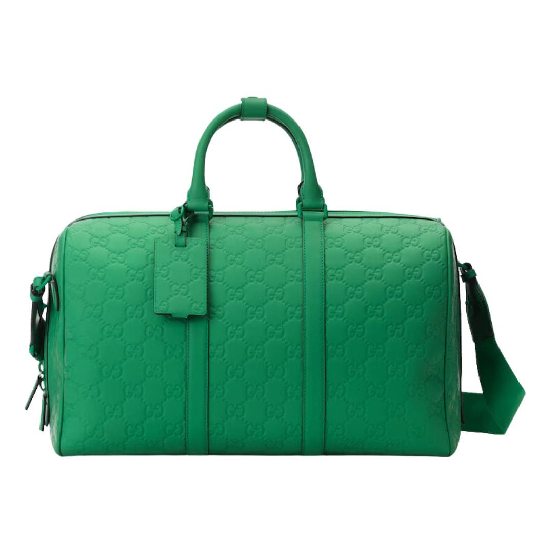 Inside, the bag features additional pockets, including a zip pocket and slip pockets, to help you stay organized. The meticulous attention to detail is evident in the fine stitching and the high-quality hardware, which includes the iconic double G logo in antique gold-tone metal. GUCCI GG RUBBER EFFECT MEDIUM DUFFLE BAG GREEN LETAHER