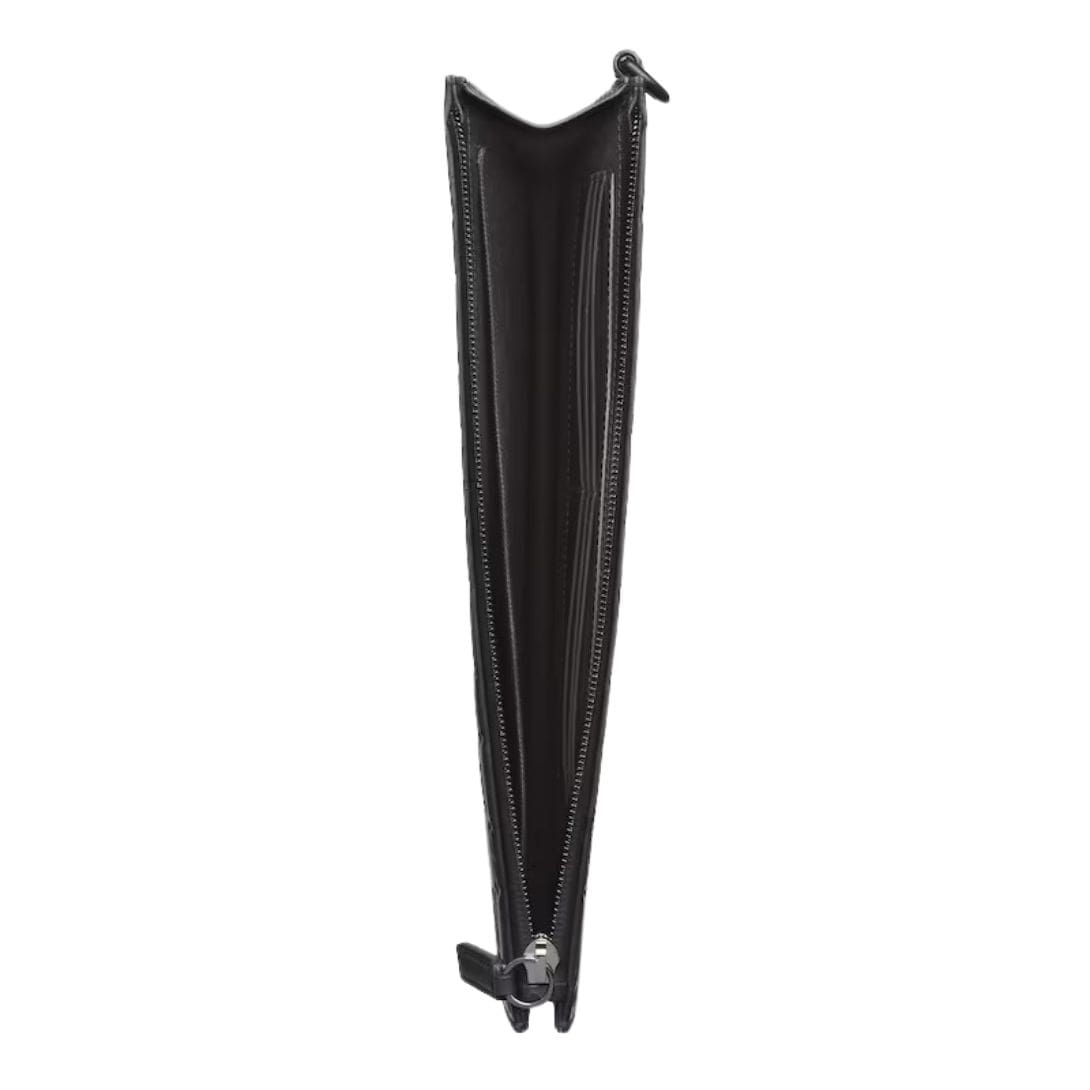 Measuring a compact yet functional size, the pouch is designed to accommodate daily essentials with ease. It features a sleek zip closure that provides secure storage while maintaining the pouch’s streamlined silhouette. The interior is lined with a smooth, contrasting fabric that adds a touch of luxury and ensures that your items are protected.