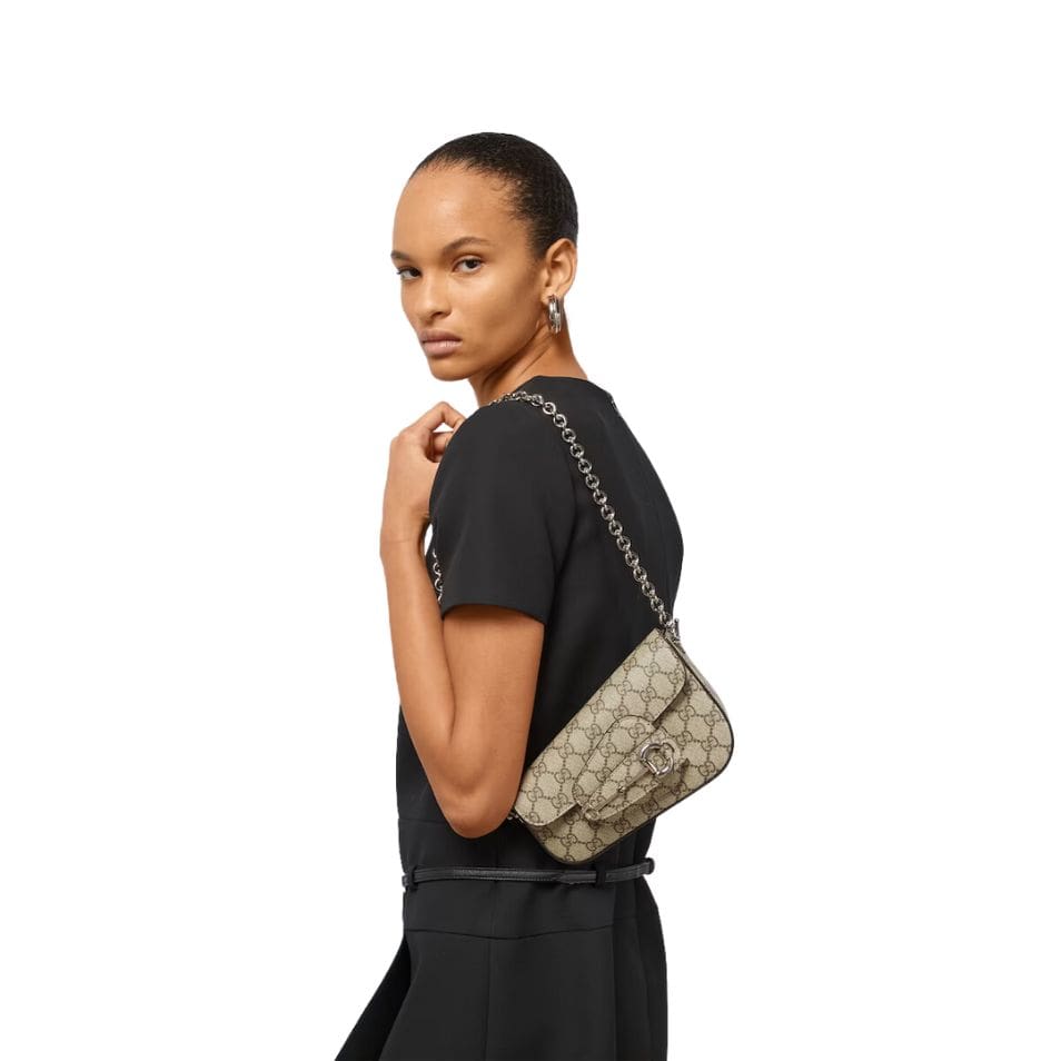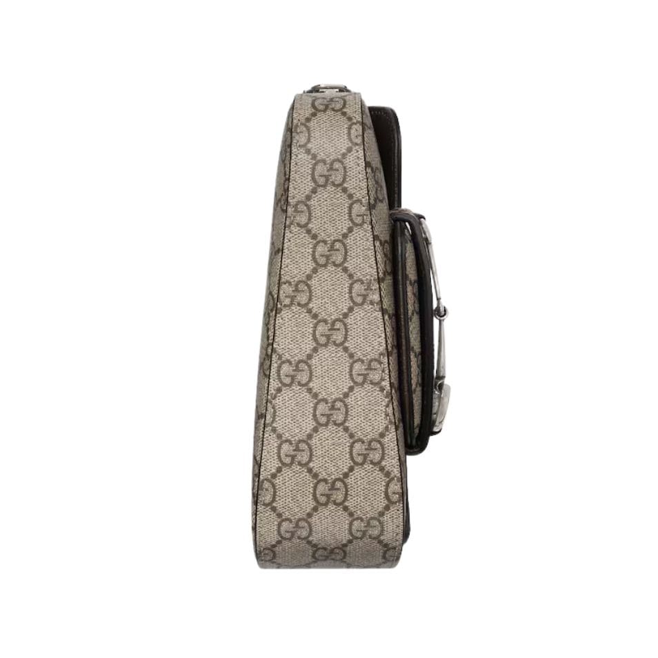 The mini size of this shoulder bag makes it a versatile choice for both daytime and evening events. The beige canvas offers a neutral, yet refined backdrop, which is beautifully complemented by the rich ebony leather trim and the striking gold-toned Horsebit hardware. The gleaming Horsebit detail is not only a nod to Gucci’s equestrian roots but also adds a touch of opulence and charm to the overall design. GUCCI HORSEBIT 1955 MINI SHOULDER BAG IN BEIG AND EBONY