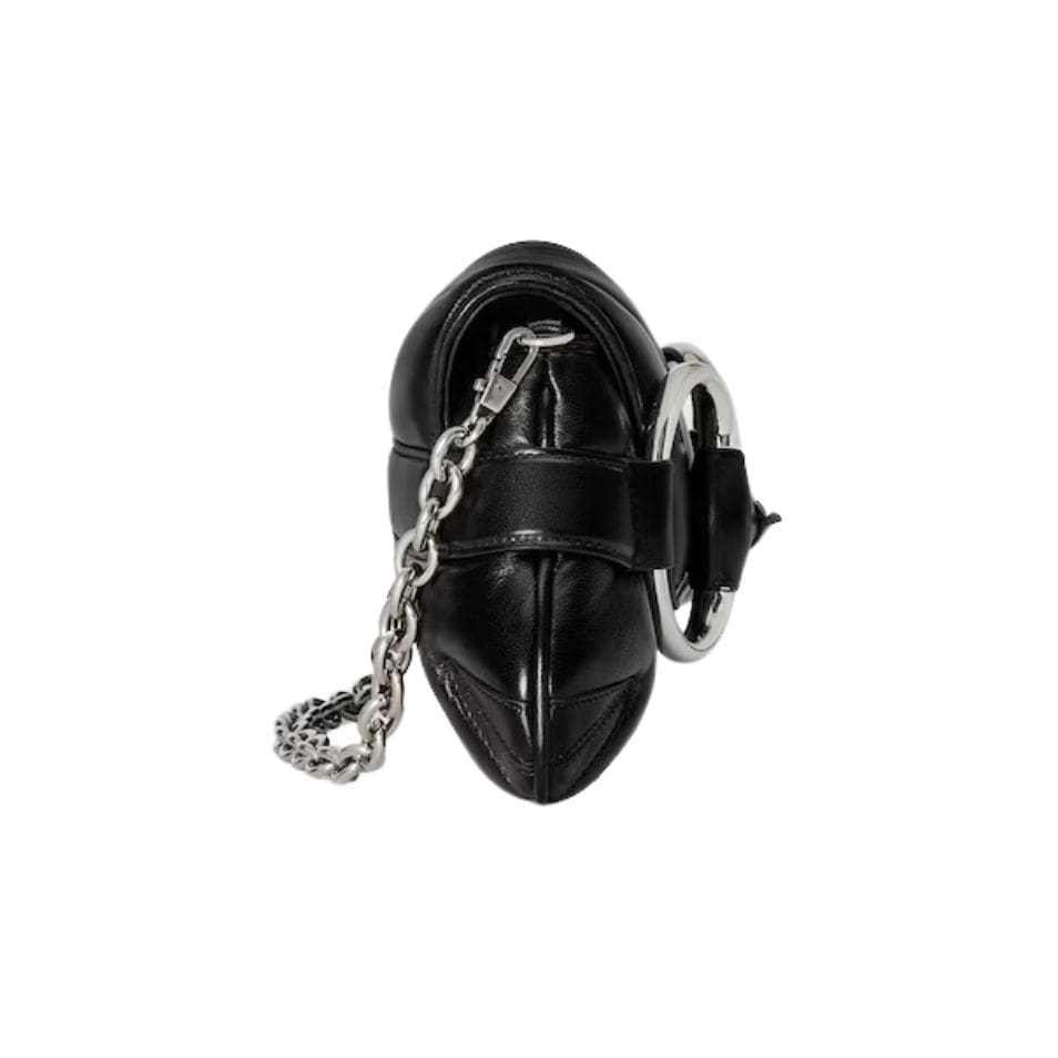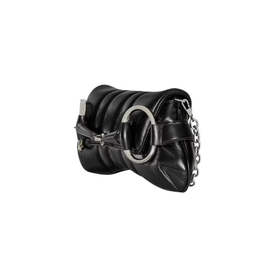 The standout feature of this bag is the distinctive horsebit hardware, a nod to Gucci’s equestrian roots. This polished metal embellishment sits prominently on the front flap, adding a touch of opulence and vintage charm to the overall design. The horsebit detail is elegantly integrated with a slim chain strap, which can be worn on the shoulder or across the body for versatile styling options. The chain is carefully crafted to ensure comfort and durability, making it a practical choice for everyday use. GUCCI HORSEBIT CHAIN SMALL SHOULDER BAG