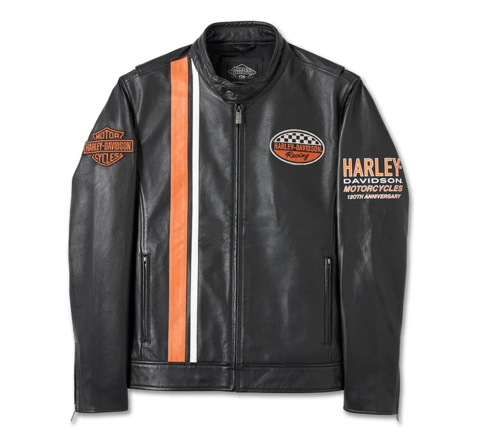 Harley Davidson Men’s 120th Anniversary Leather Jacket. Style takes a victory lap on our Limited Edition 120th Anniversary Leather Jacket. Crafted from midweight cowhide that’s two-tone washed for a well-worn vibe. Features an action back, mandarin collar, and contrast leather striping for an elevated, race-inspired look. Both sleeves and the front are finished with branding to celebrate our winning legacy that’s 120 years in the making. This commemorative find is only here while supplies last, so order soon.