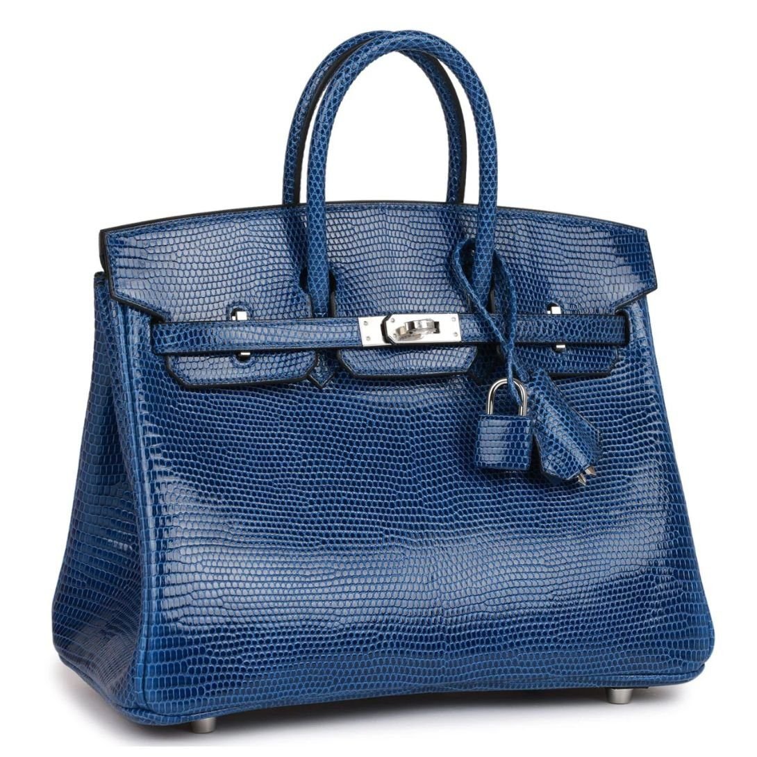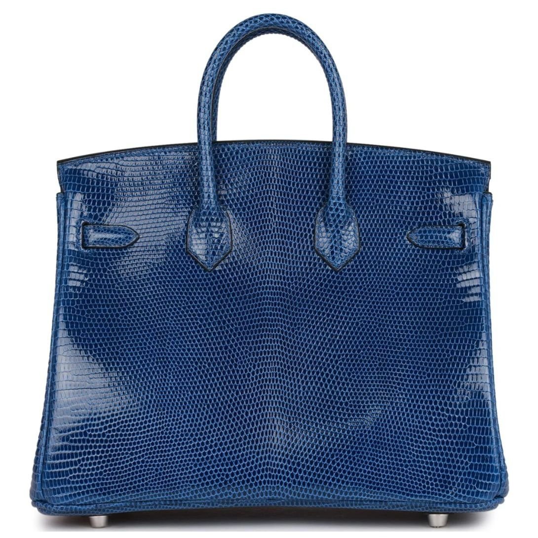 This Hermès Birkin is made from Bleu Saphir lizard leather with palladium hardware. It features tonal stitching, a front strap, two straps with center toggle closure, clochette with lock and two keys, and double rolled handles.