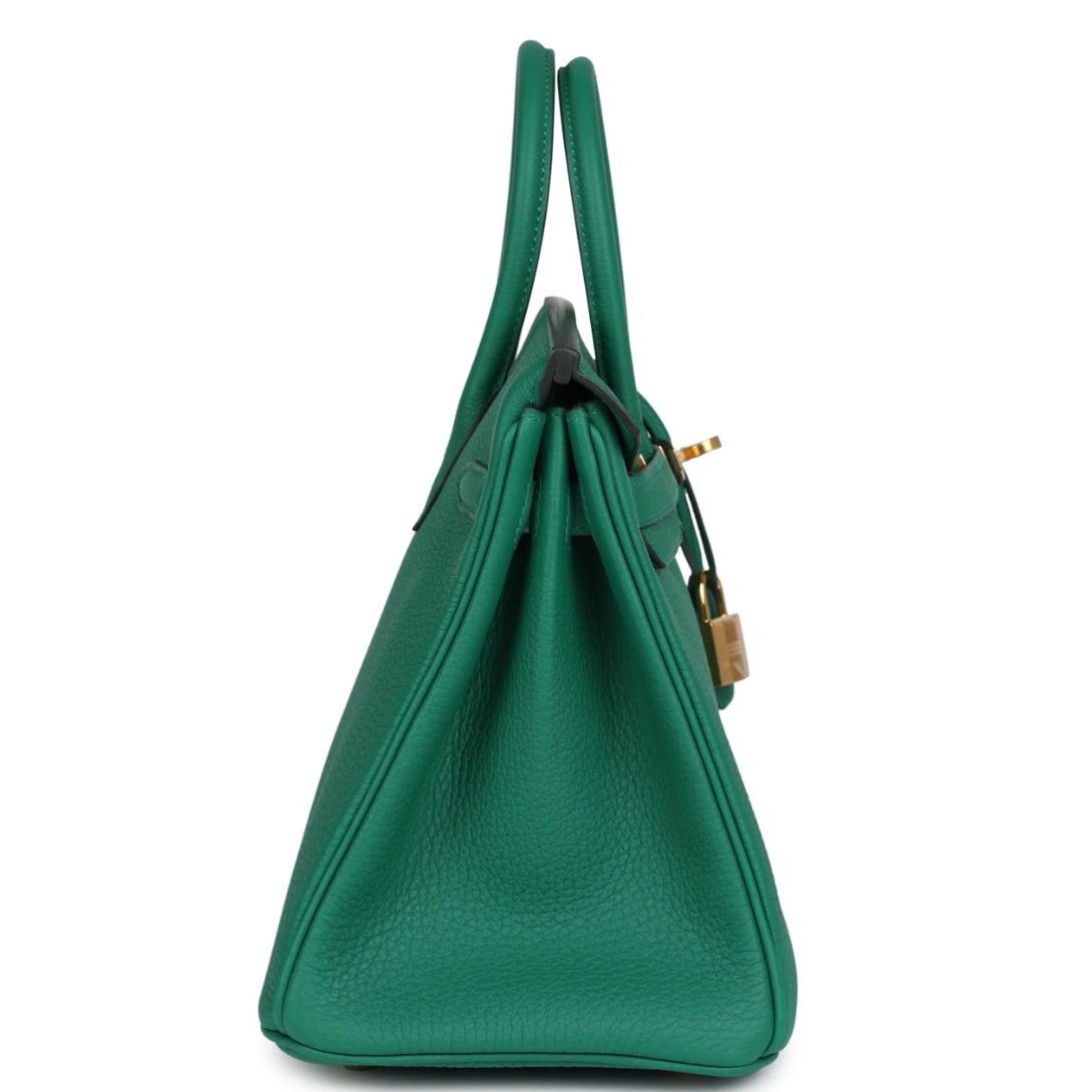 This Birkin is crafted from Vert Vertigo togo leather with gold hardware, featuring tonal stitching and a front flap with two straps and a center toggle closure. It includes a clochette with lock and two keys, along with double rolled handles. The combination of Vert Vertigo leather and gold hardware gives this Birkin an elegant and timeless look.