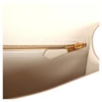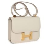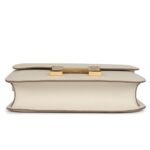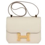 This Constance is crafted from Craie Epsom leather with gold hardware, featuring tonal stitching, a metal “H” snap lock closure, and an adjustable shoulder strap for both functionality and elegance.