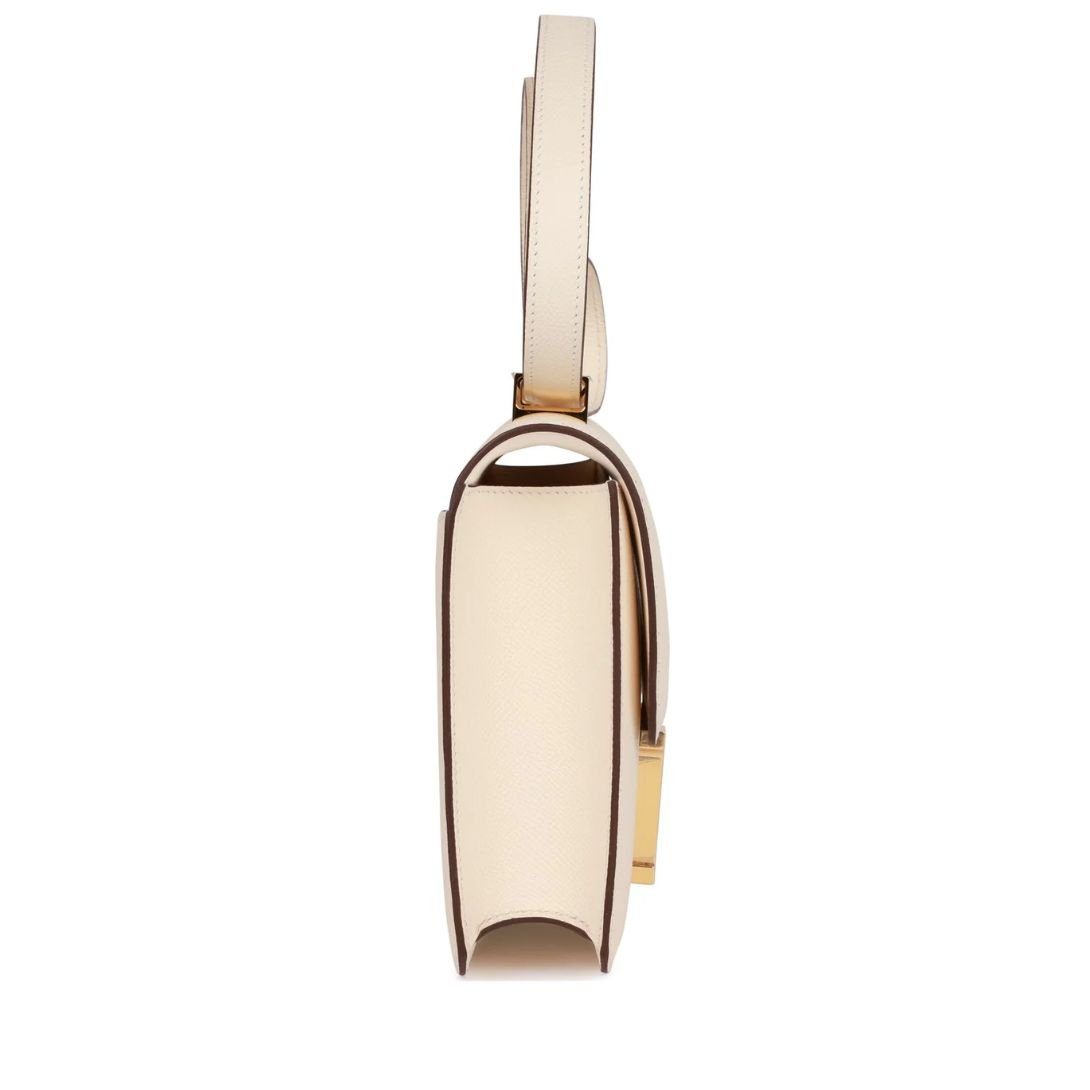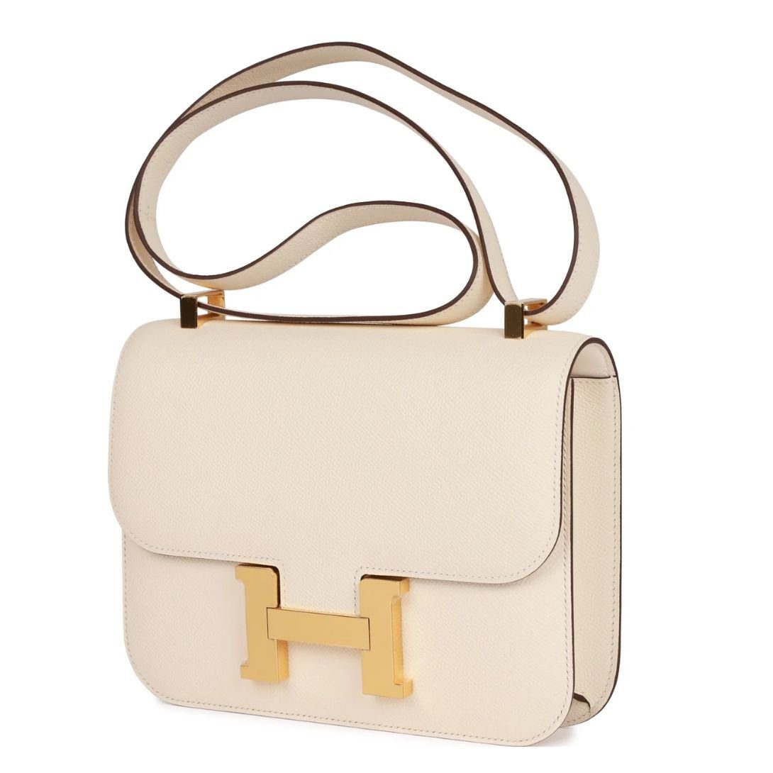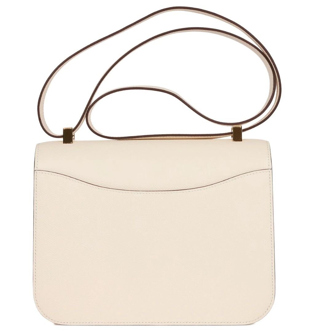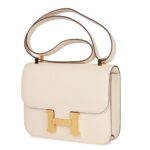 This Hermès Constance is crafted from Nata epsom leather and features gold hardware. It has tonal stitching, a signature metal “H” snap lock closure, and an adjustable shoulder strap, offering a perfect balance of luxury and versatility.