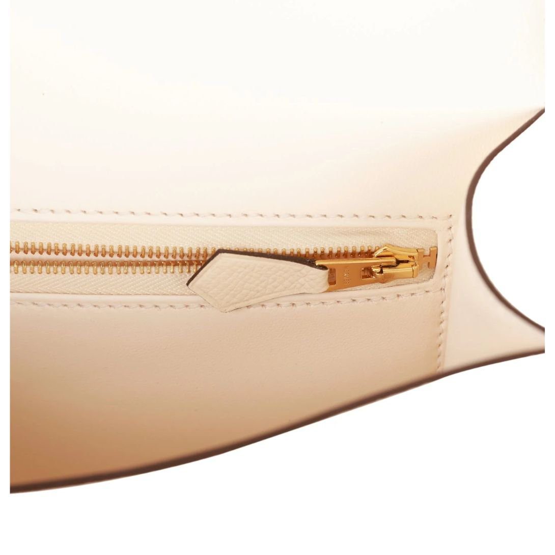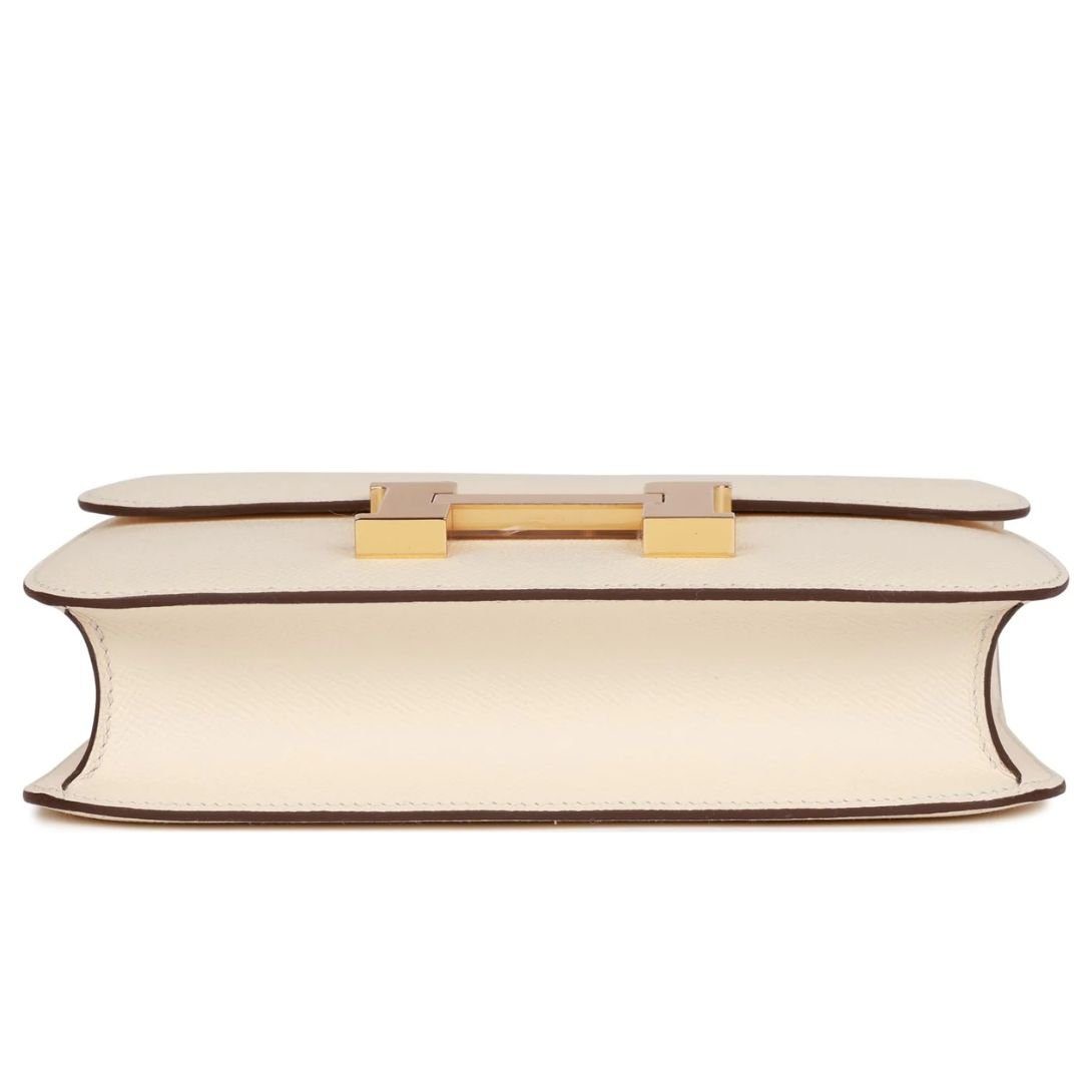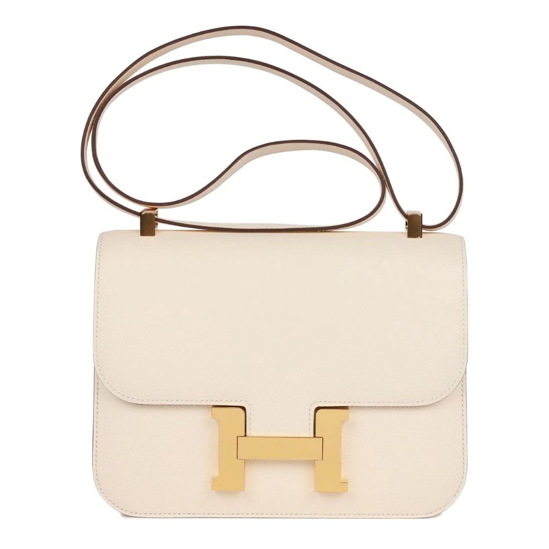 This Hermès Constance is crafted from Nata epsom leather and features gold hardware. It has tonal stitching, a signature metal “H” snap lock closure, and an adjustable shoulder strap, offering a perfect balance of luxury and versatility.