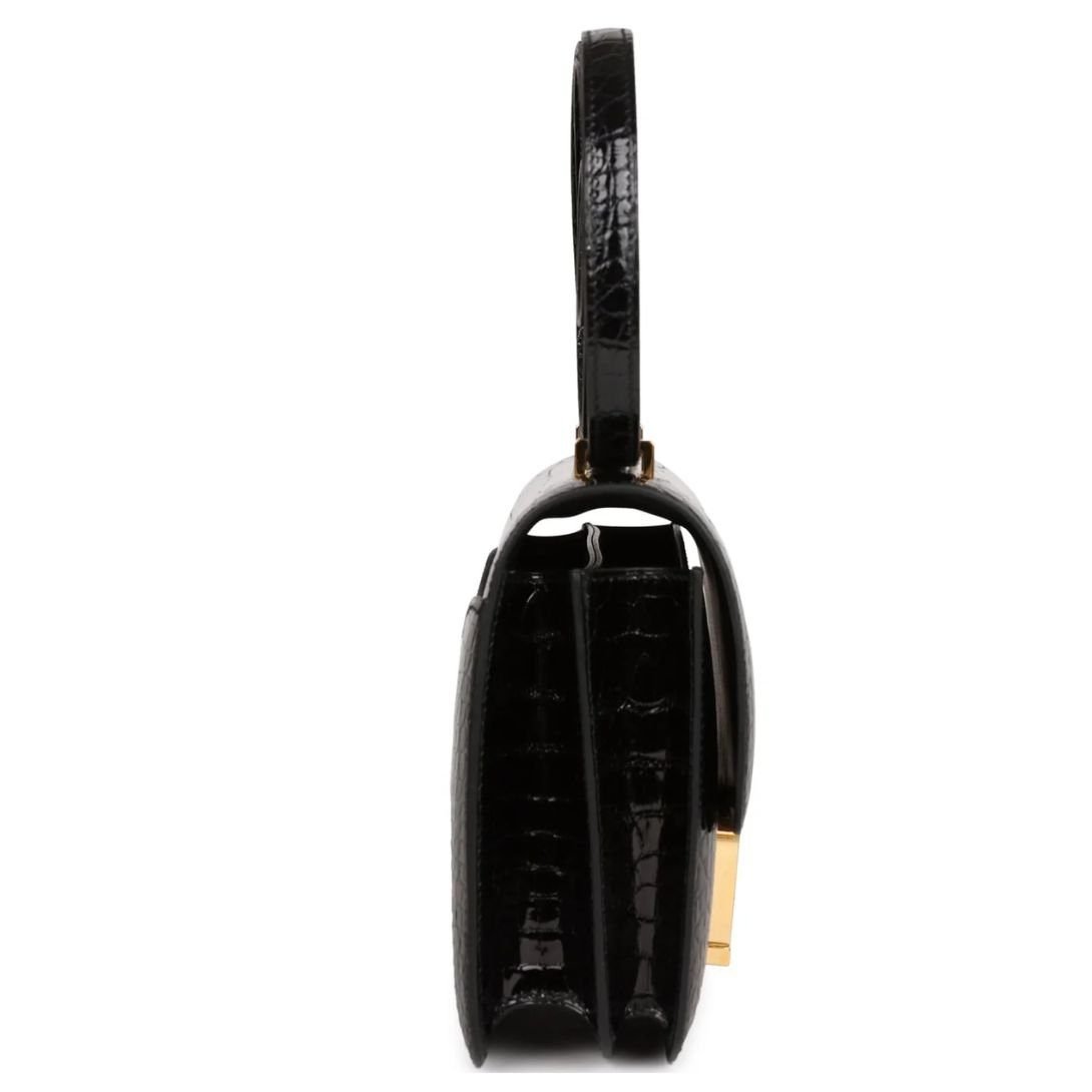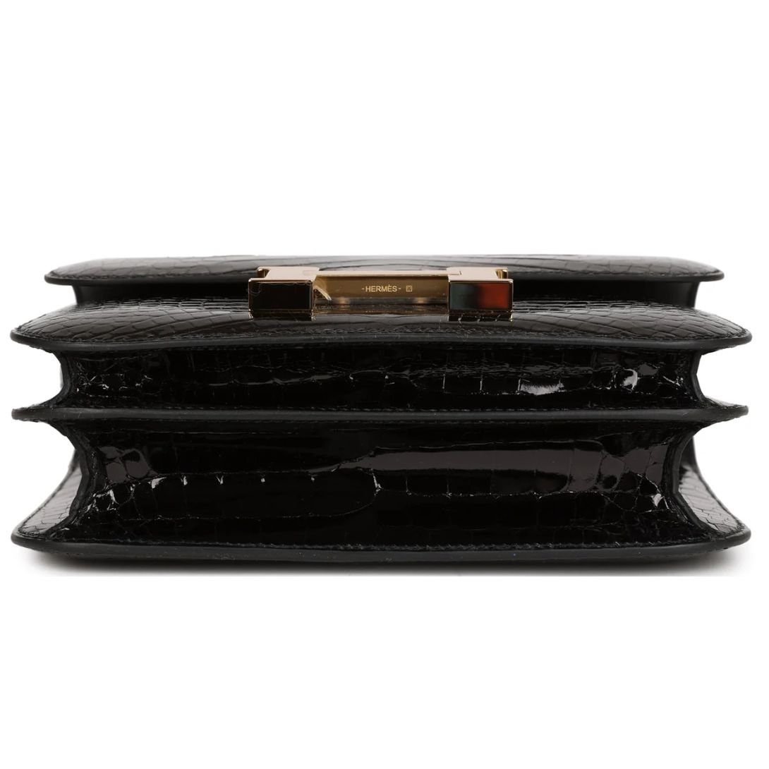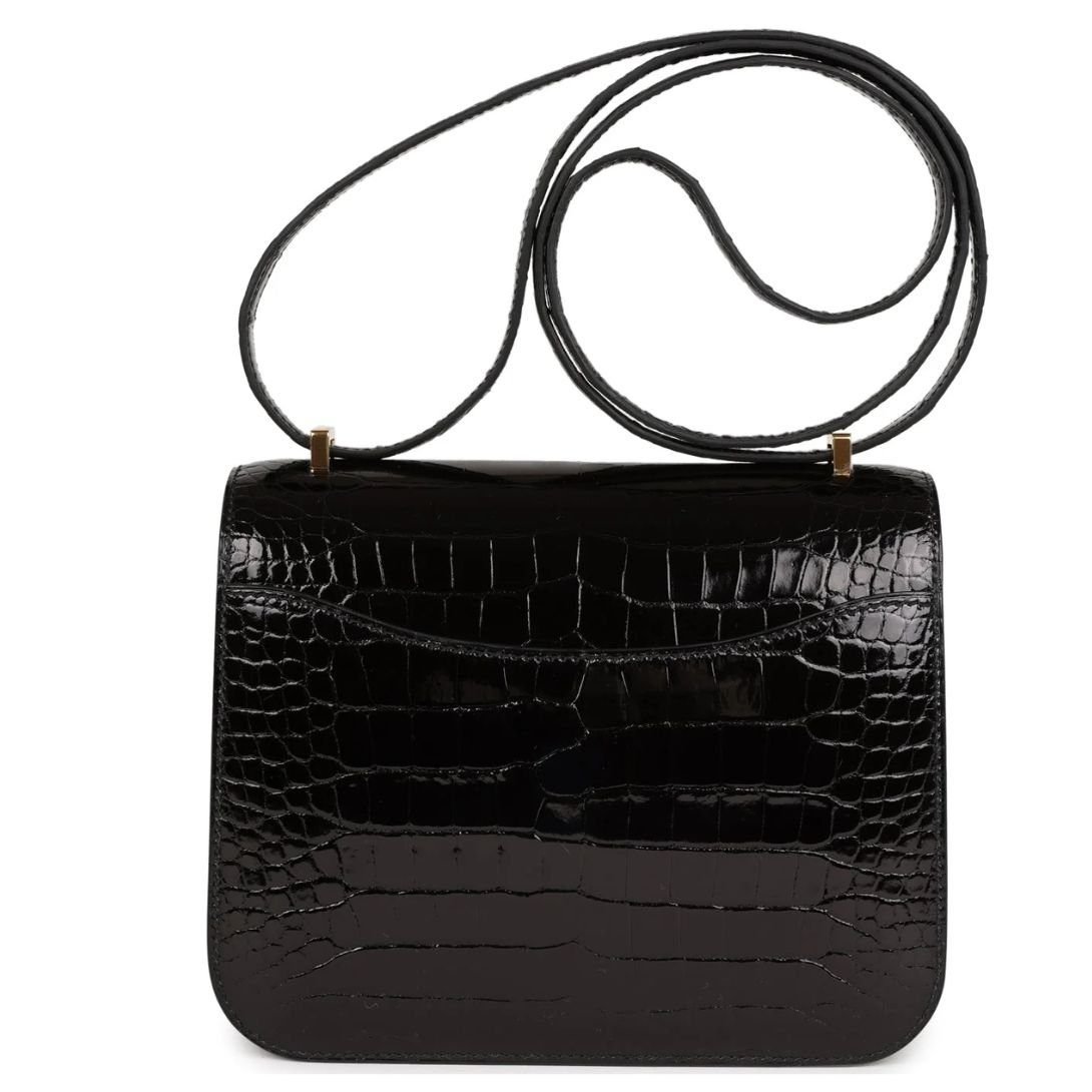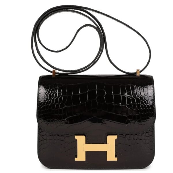 The Hermès Constance in Black Shiny Mississippiensis Alligator leather with Gold hardware is a luxurious and rare piece. This elegant bag features tonal stitching, the signature “H” snap lock closure, and an adjustable shoulder strap for versatile wear.